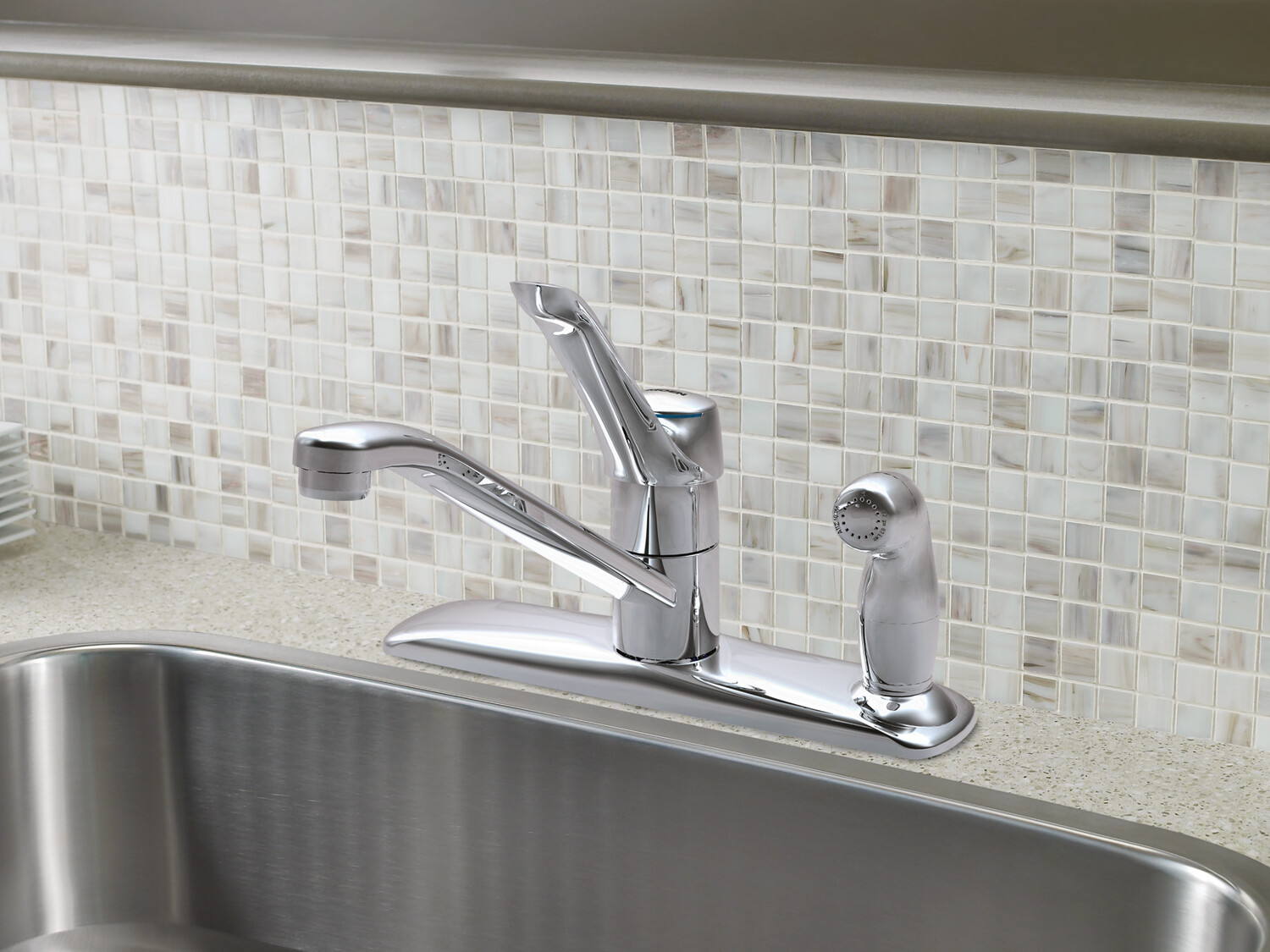• Хромированная отделка создает яркий, хорошо отражающий свет внешний вид, в то время как излив с низкой дугой предназначен для более традиционной кухни.