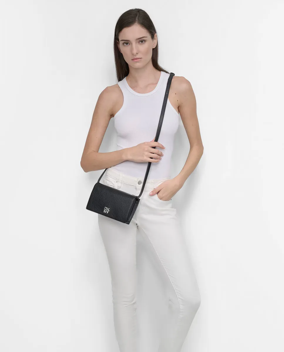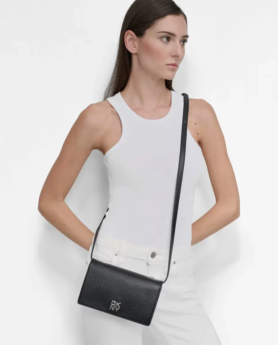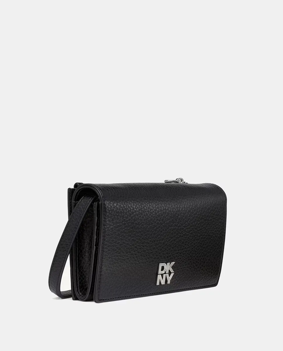 Сумка-кошелек ETTA с перекрестным ремешком, клапаном с магнитной застежкой и логотипом DKNY из металла спереди. Карман на молнии на молнии на молнии на молнии сзади.