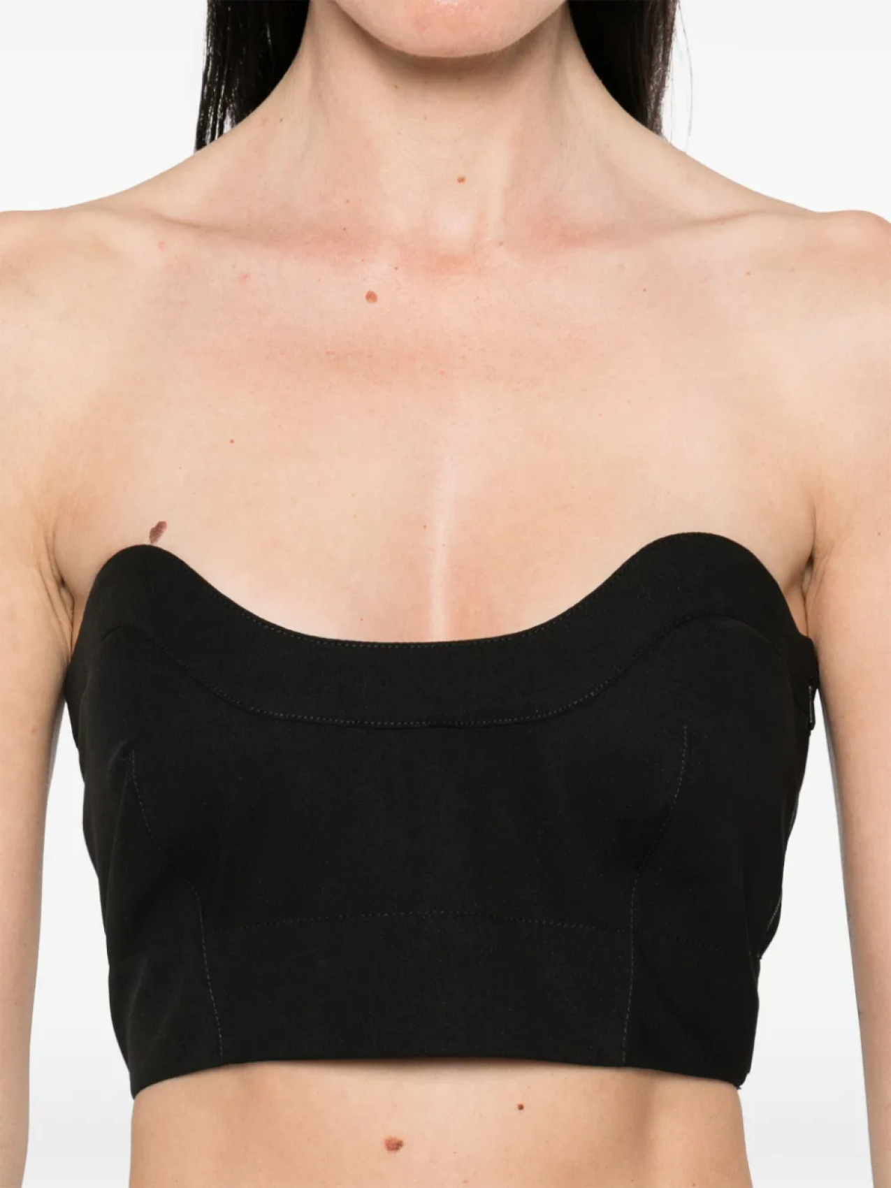 Черная потайная молния сбоку, округлый вырез горловины, две съемные лямки, подкладка по всей длине