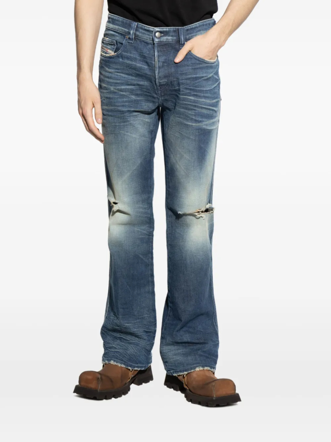 Потайная застежка на пуговицы и ширинку индиго-синего цвета, пять классических карманов, рваные детали, шлевки для ремня