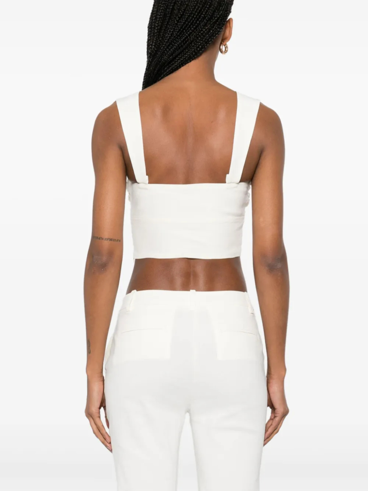Светло-бежевый, скрытая застежка-молния сбоку, вырез сердечком, без рукавов, укороченный