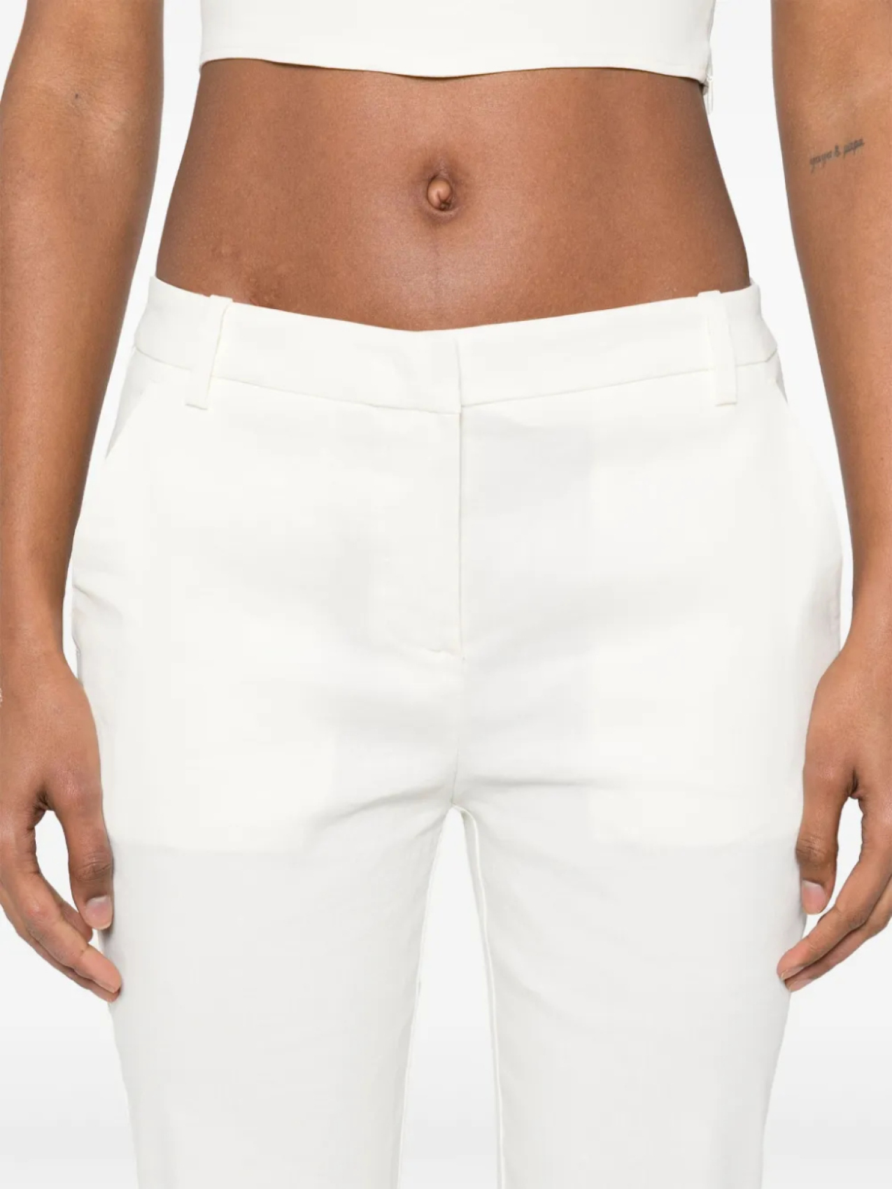Светло-бежевого цвета, потайная застежка на пуговицы, крючок и молнию спереди, шлевки для ремня, два прорезных кармана по бокам, два прорезных кармана сзади