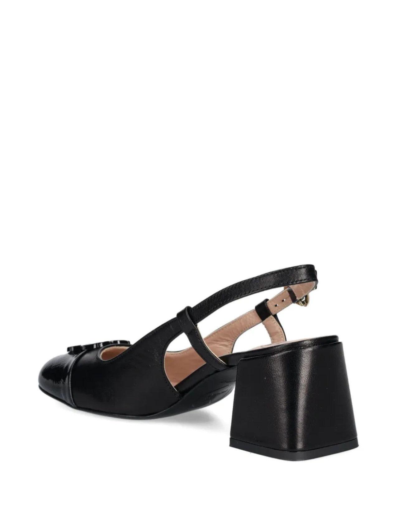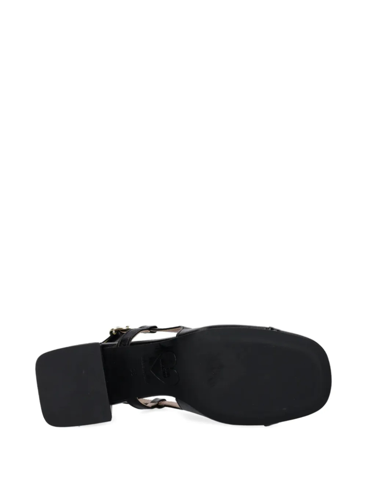 Черная застежка на пряжке, ремешок на пятке, фирменная стелька, круглый носок, каблук средней высоты