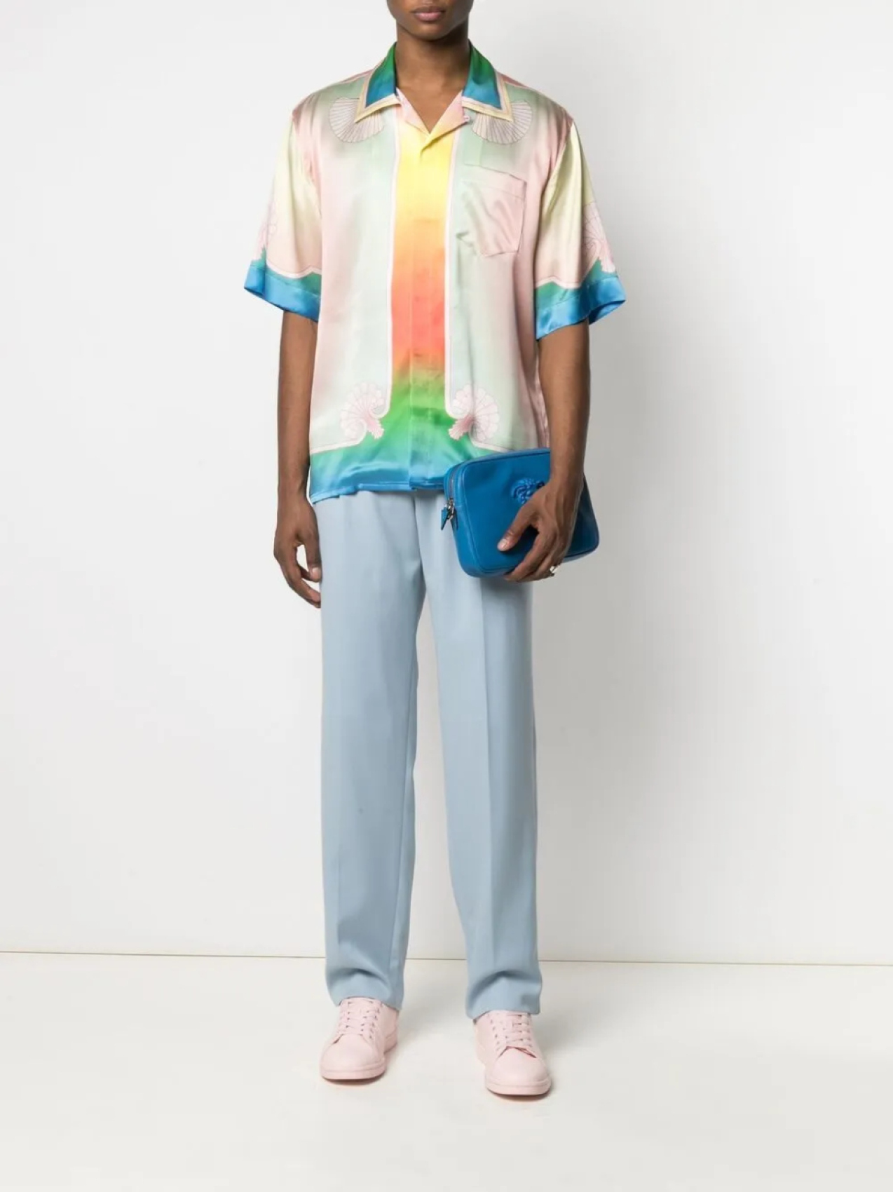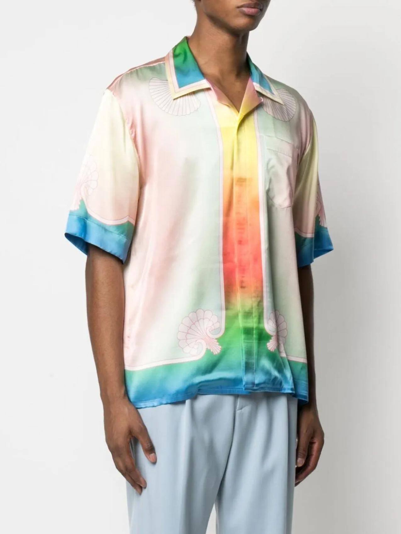 Градиентный эффект, классический воротник, застежка на пуговицах спереди, короткие рукава и прямой подол. Цвет: разноцветный.