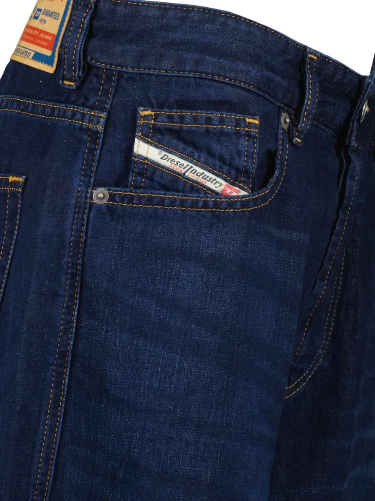 Синяя застежка на пуговицы спереди, нашивка с логотипом сзади, шлевки для ремня, широкие штанины