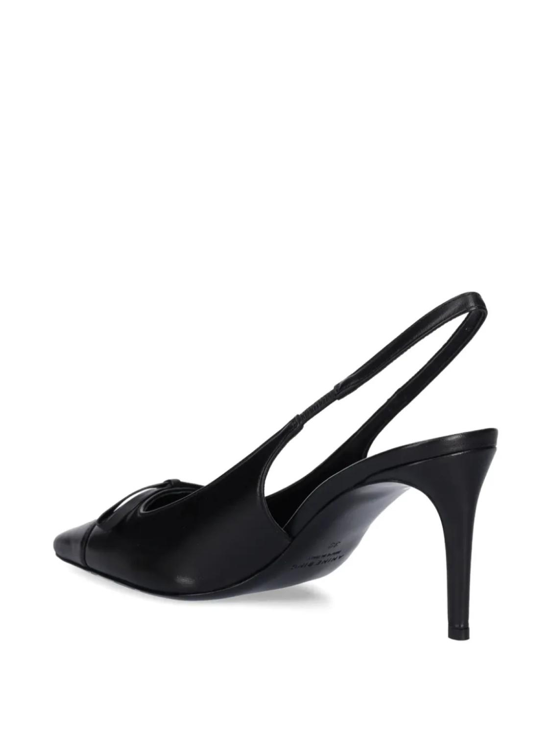 Черный гладкий силуэт, изящный бант, тонкий каблук, фирменный логотип, открытая спина