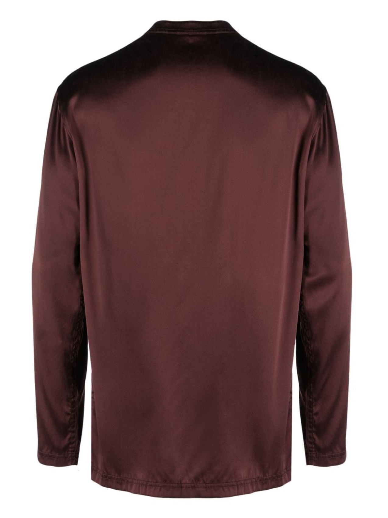 Кофейный, эластичный шелк, вырез хенли, длинные рукава и прямой подол.