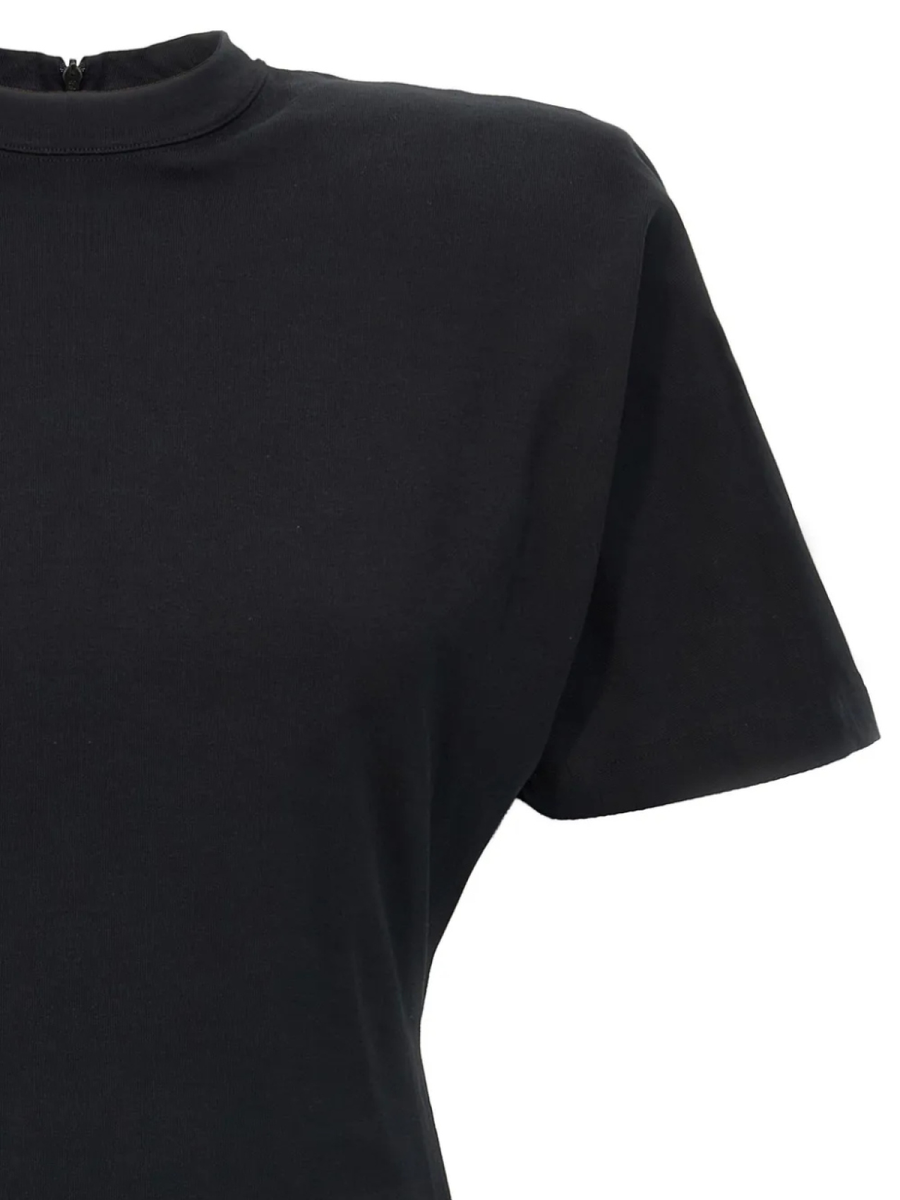 Черный с высоким воротом, короткими рукавами, застежкой-молнией сзади, регулируемым ремешком сзади