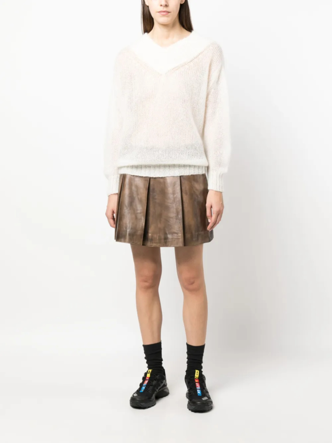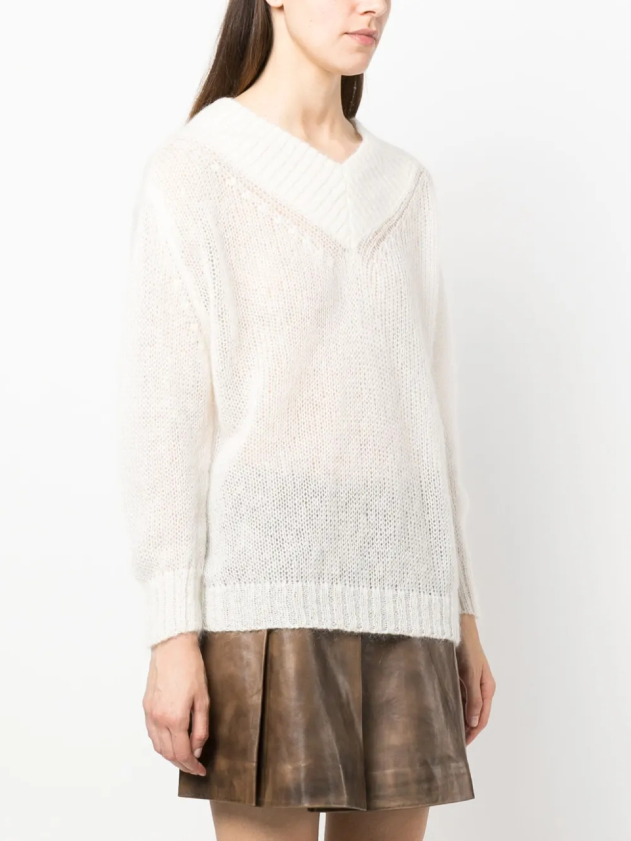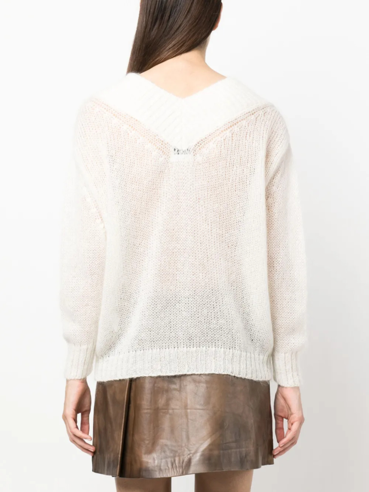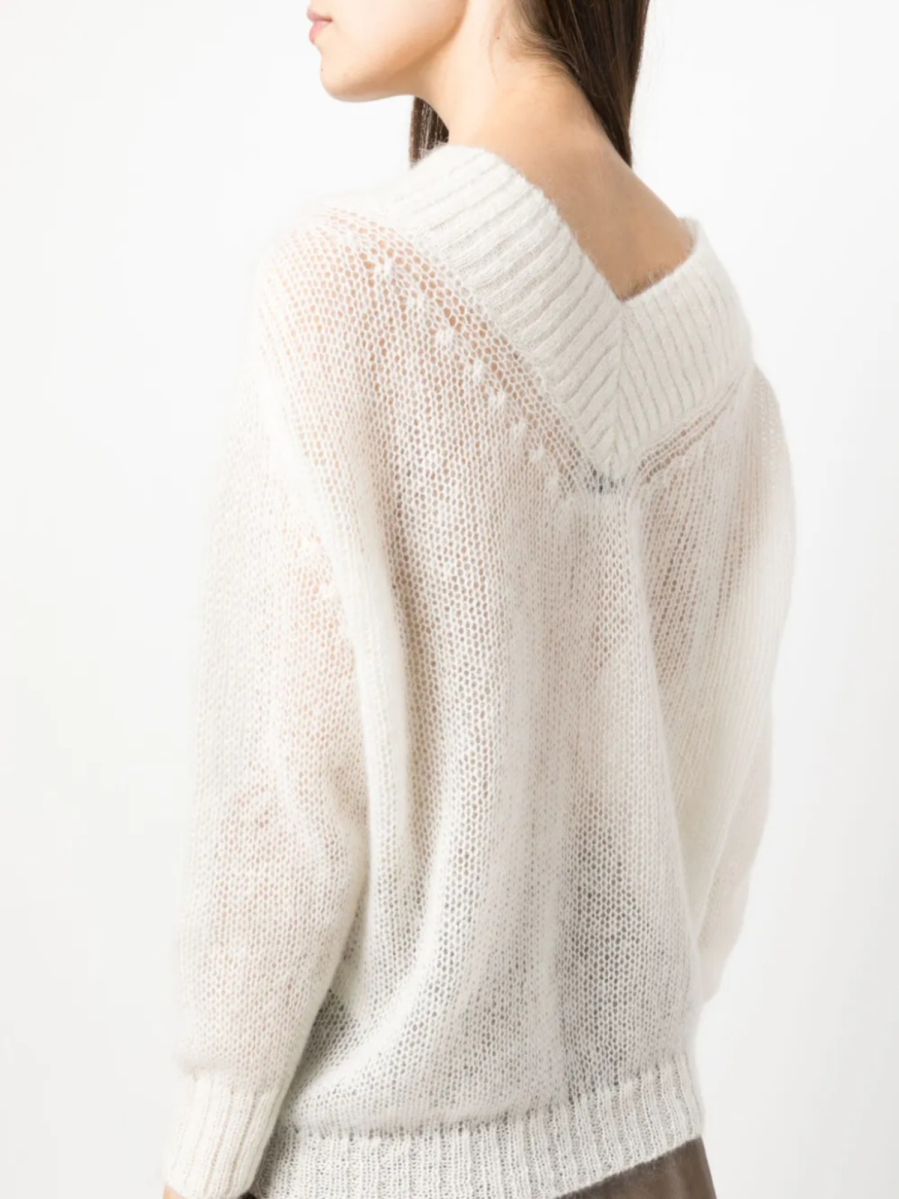 Цвет слоновой кости, смесовый мохер, ажурная вязка, отделка в рубчик, V-образный вырез, V-образный вырез сзади, длинные рукава и прямой подол.