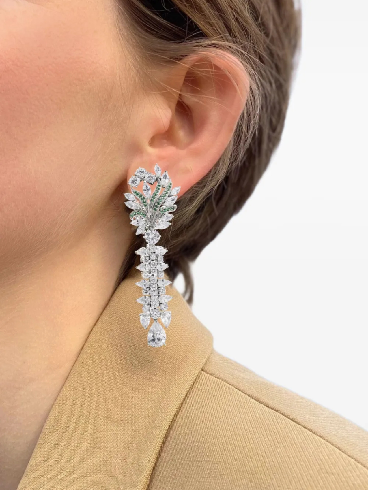 Застёжка-клипса "Омега" с белым кристаллом. Обычное ежедневное использование и воздействие внешних факторов могут привести к потере блеска драгоценных камней и золотых поверхностей. Для ухода используйте специальные неабразивные средства, предназначенные для чистки ювелирных изделий. Серьги поставляются парой.