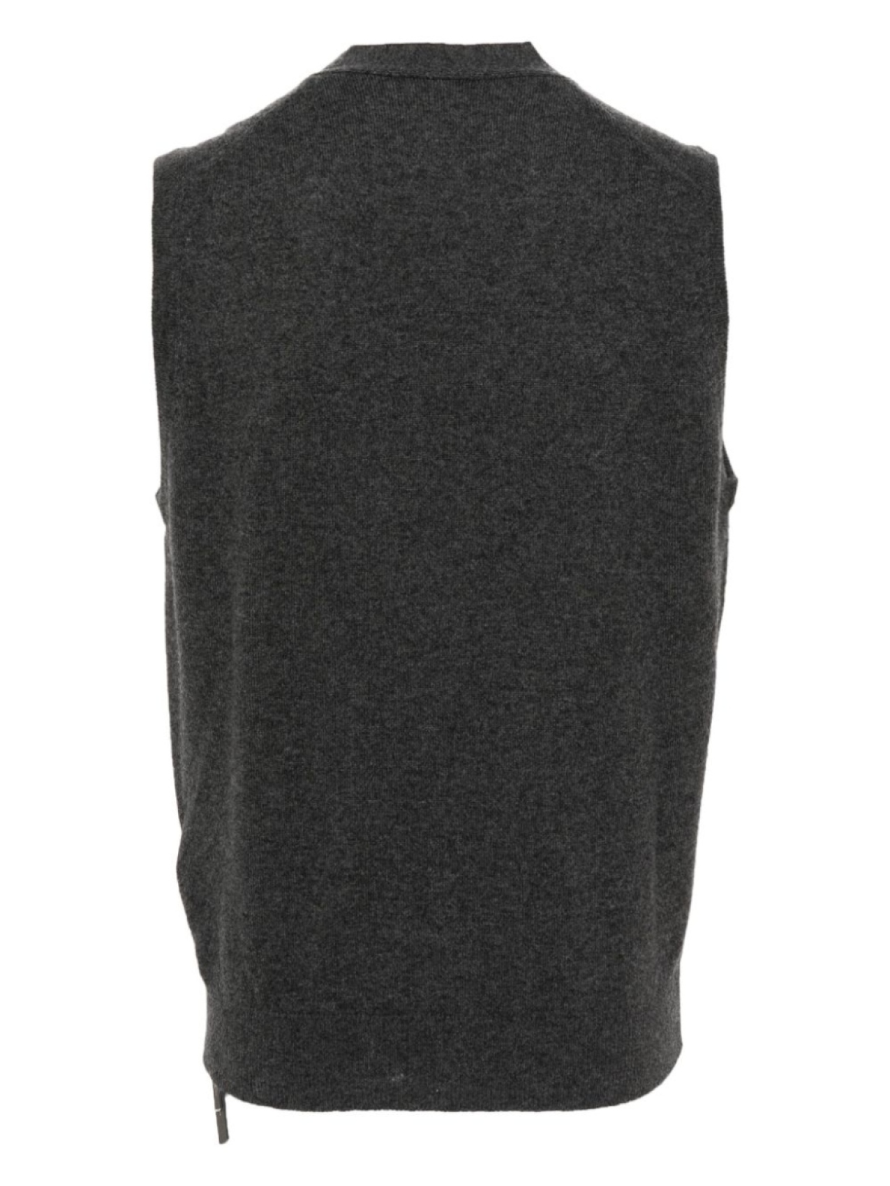 Темно-серый, кашемир, вязаные края в рубчик, V-образный вырез, застежка на пуговицах спереди, без рукавов и прямой подол.