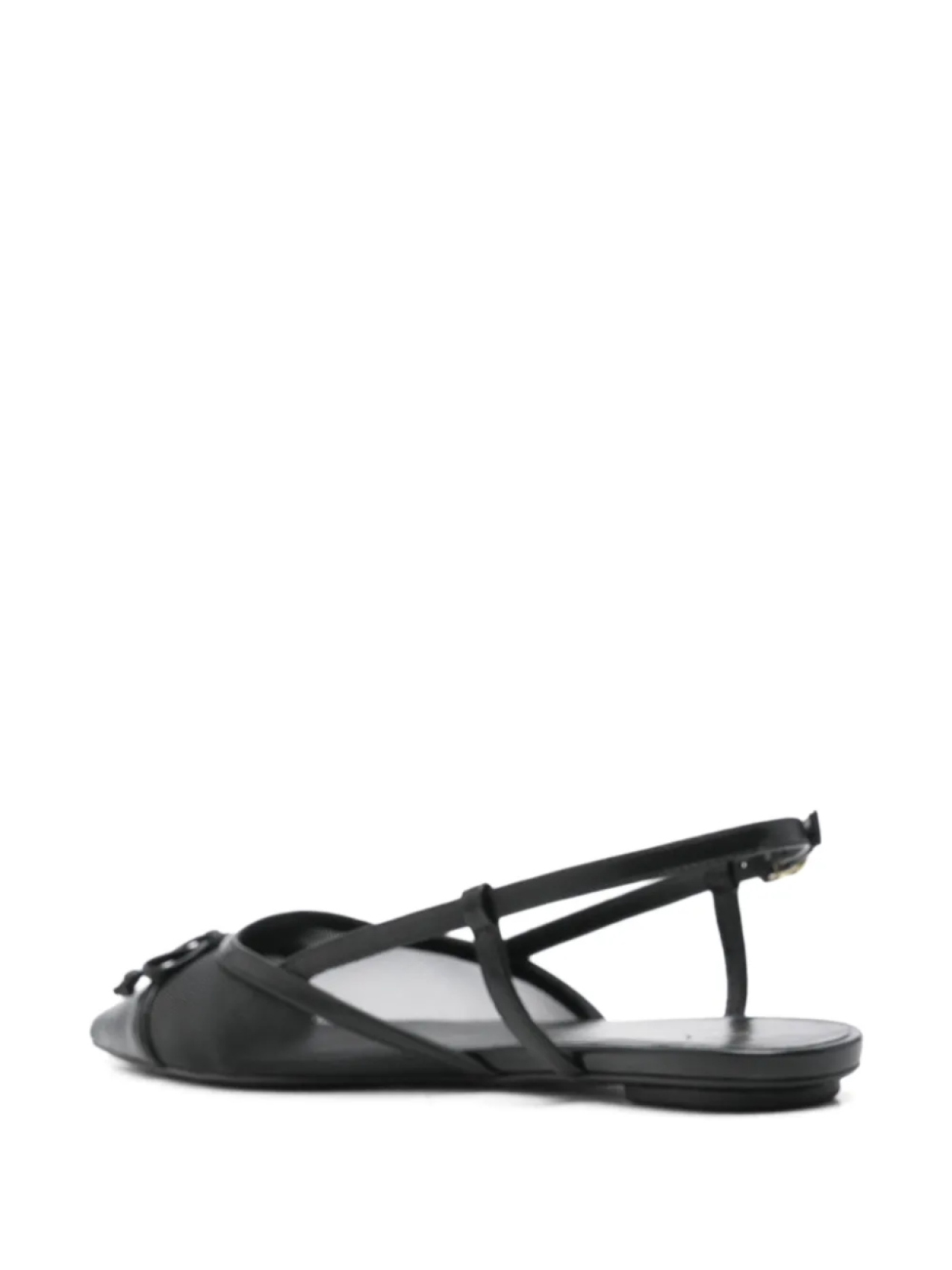 Черная застежка на пряжке, ремешок на пятке, плоская кожаная подошва, фирменная стелька, отделка бантом