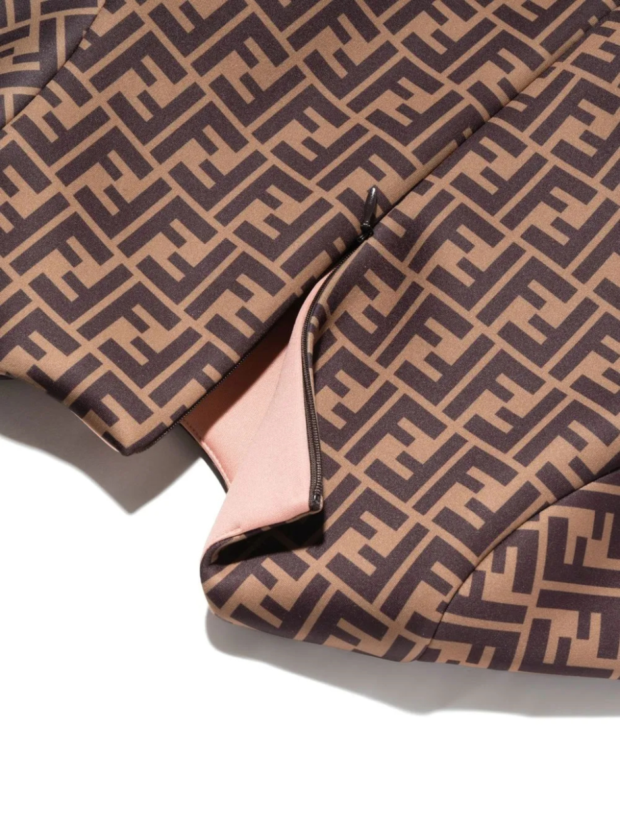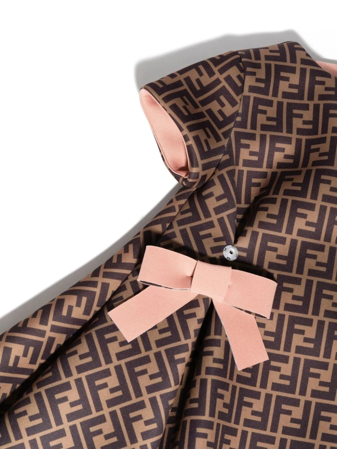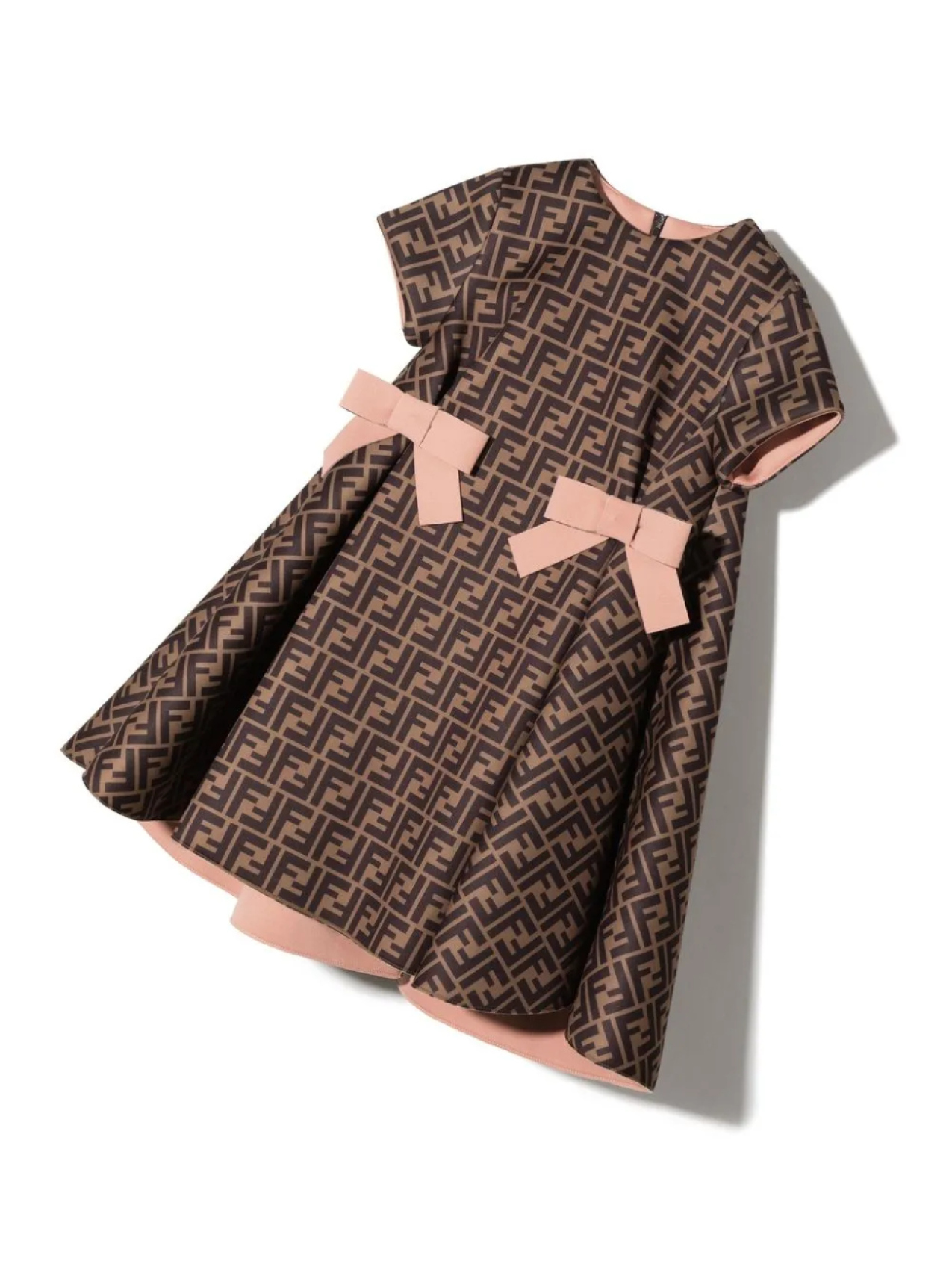 Коричневый, узор с изображением монограммы, круглый вырез, короткие рукава, бант и юбка А-образного силуэта.