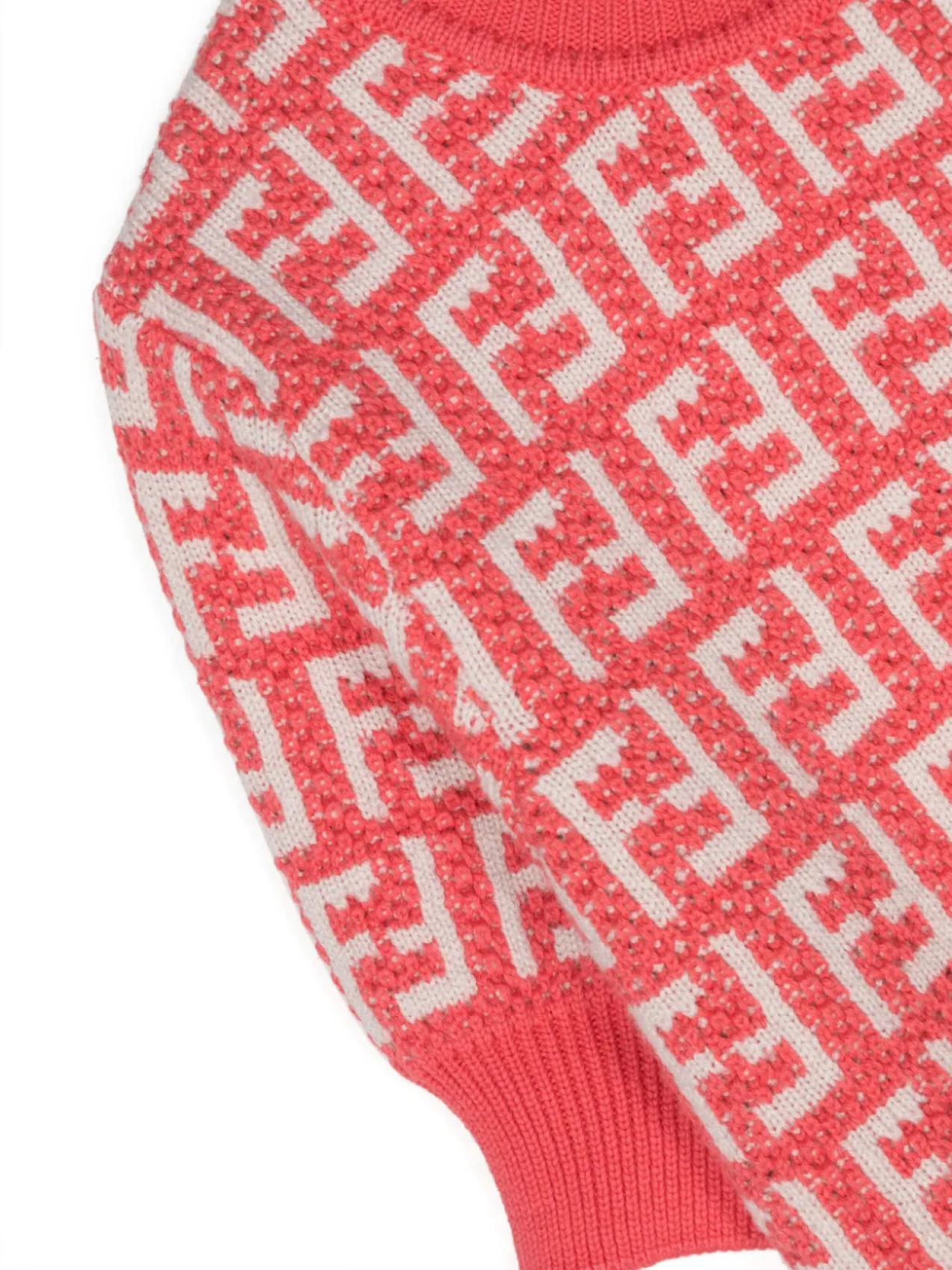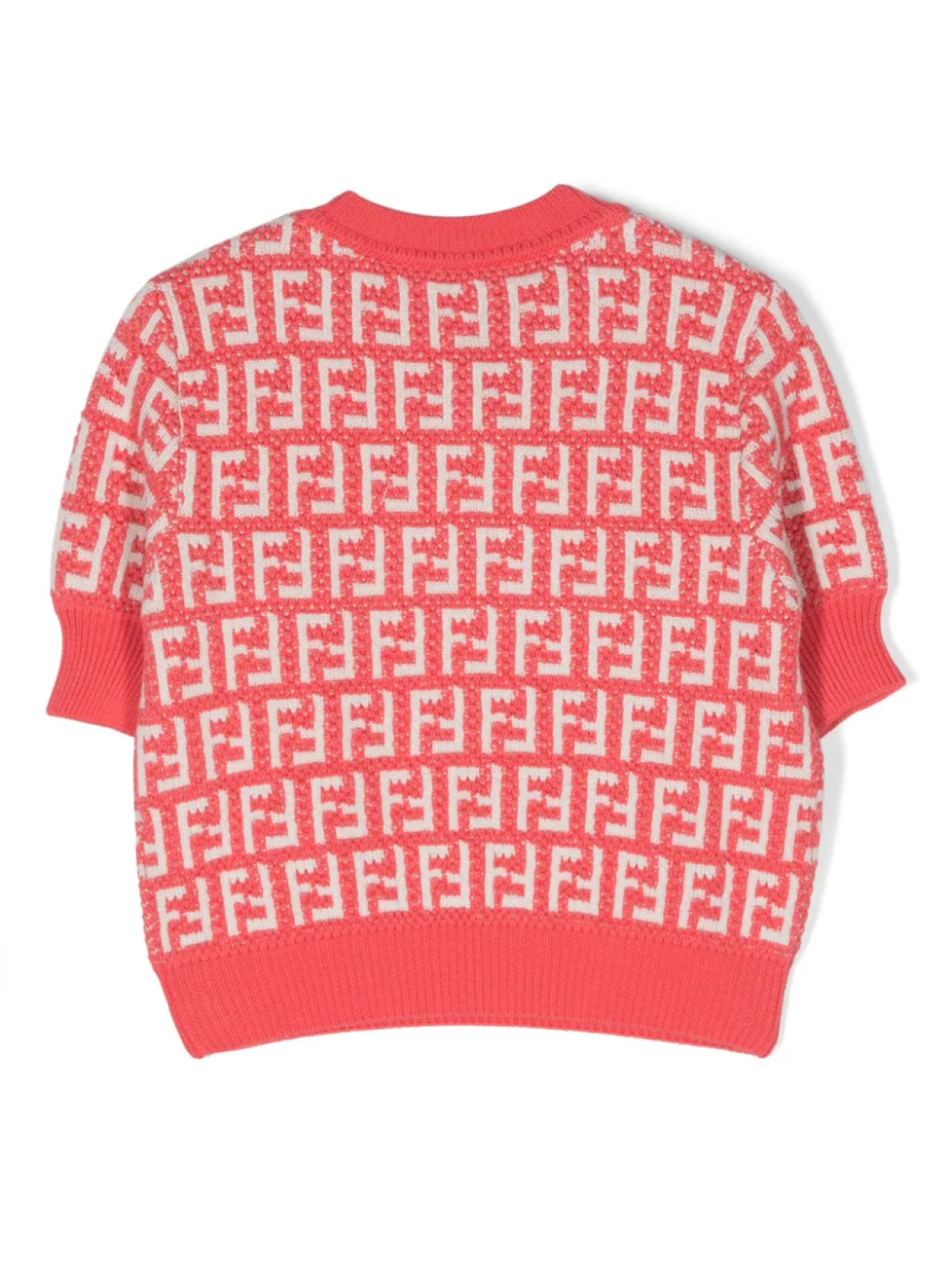 Кораллово-розовый, смесь хлопка и шерсти, трикотажный материал, логотип FF, круглый вырез, короткие рукава и прямой подол.