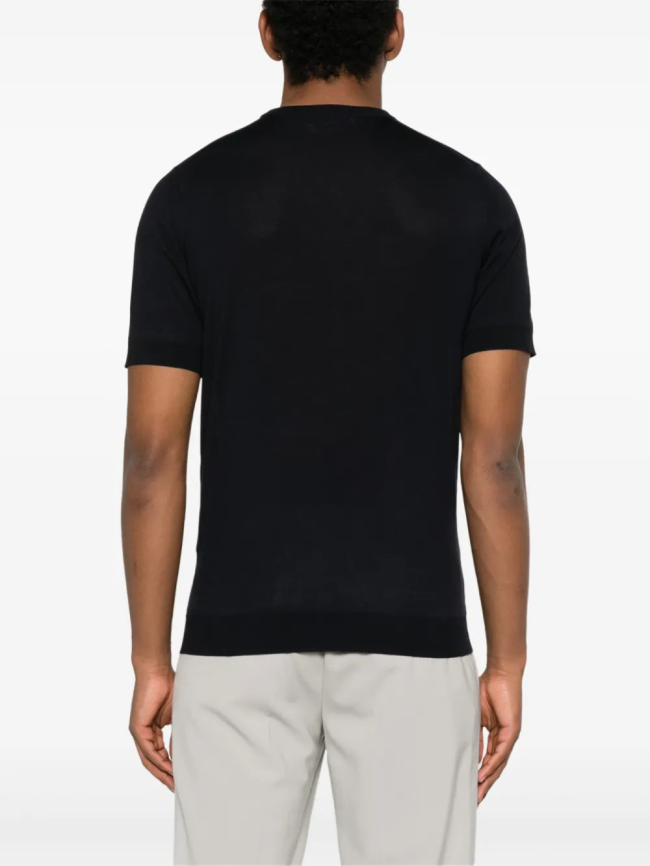 Темно-синий круглый вырез горловины, ребристые манжеты и подгиб, короткие рукава
