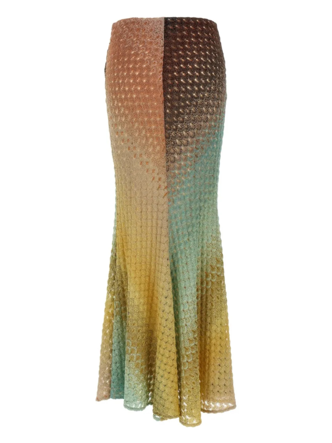 Многоцветный тканый дизайн, силуэт «русалка», эластичный пояс, мерцающая текстура, расклешенный подол, геометрический узор
