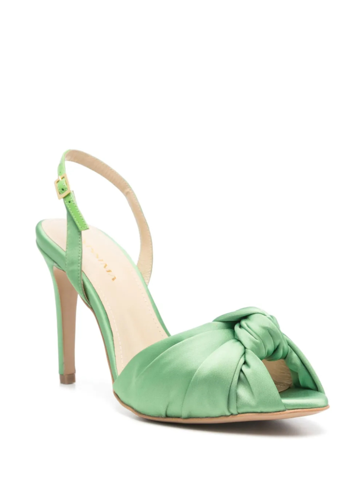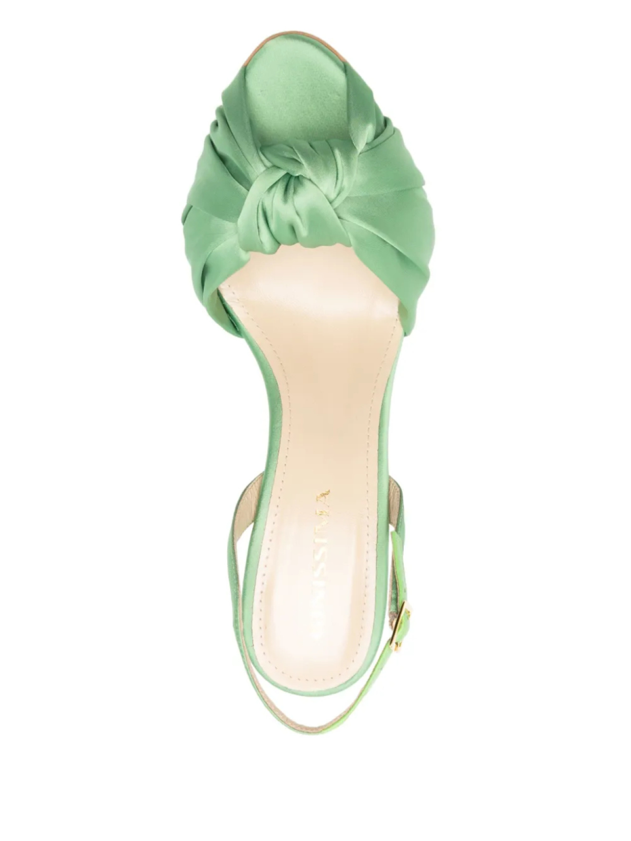 Застежка на пряжке травянисто-зелёного цвета, ремешок на пятке, фирменная стелька, декоративный узел, открытый носок