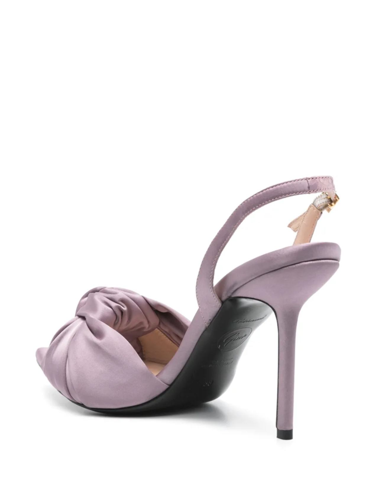 Сиреневый фиолетовый цвет, застежка на пряжке, ремешок на пятке, фирменная стелька, открытый носок, завязывающийся узел