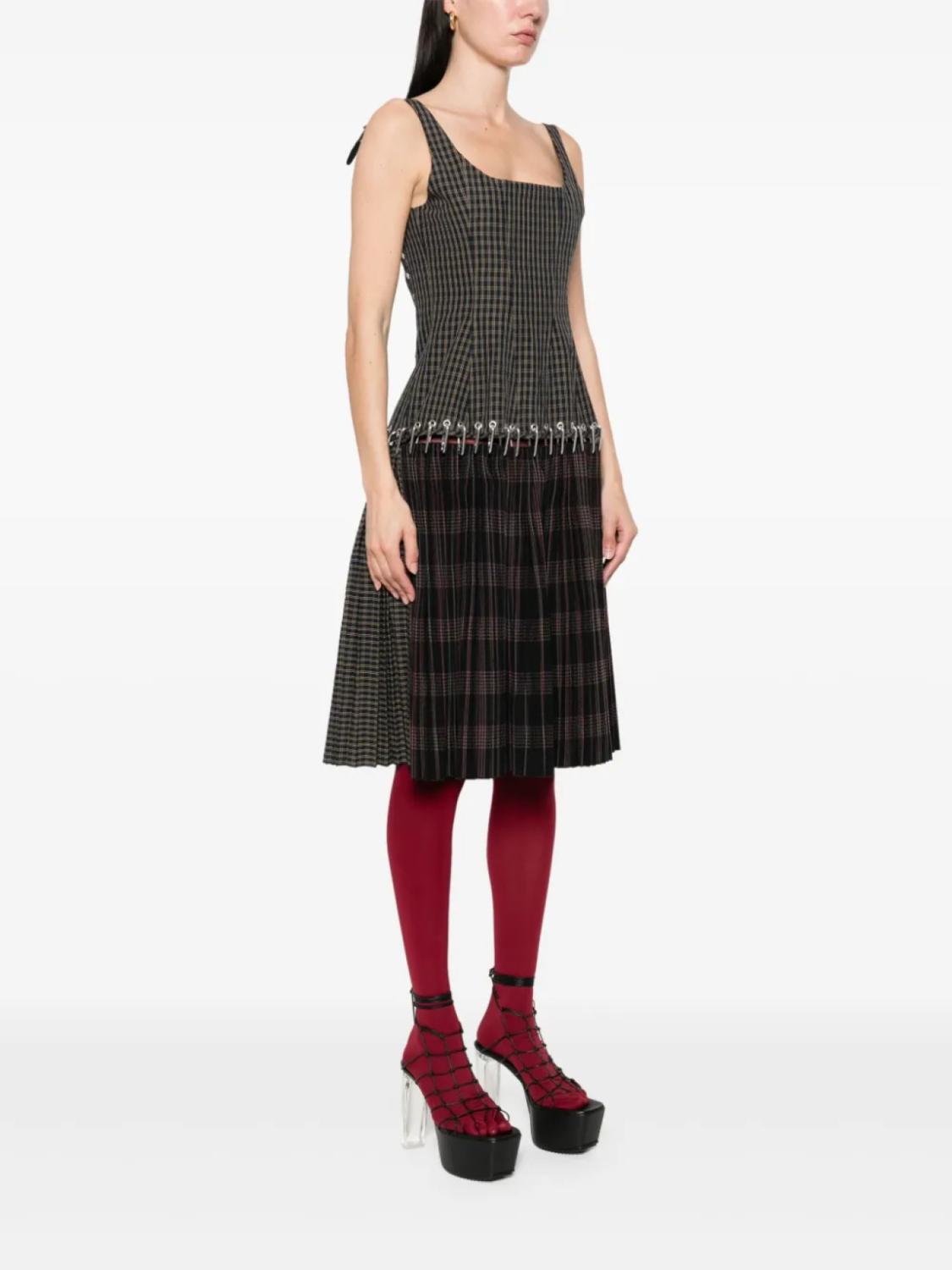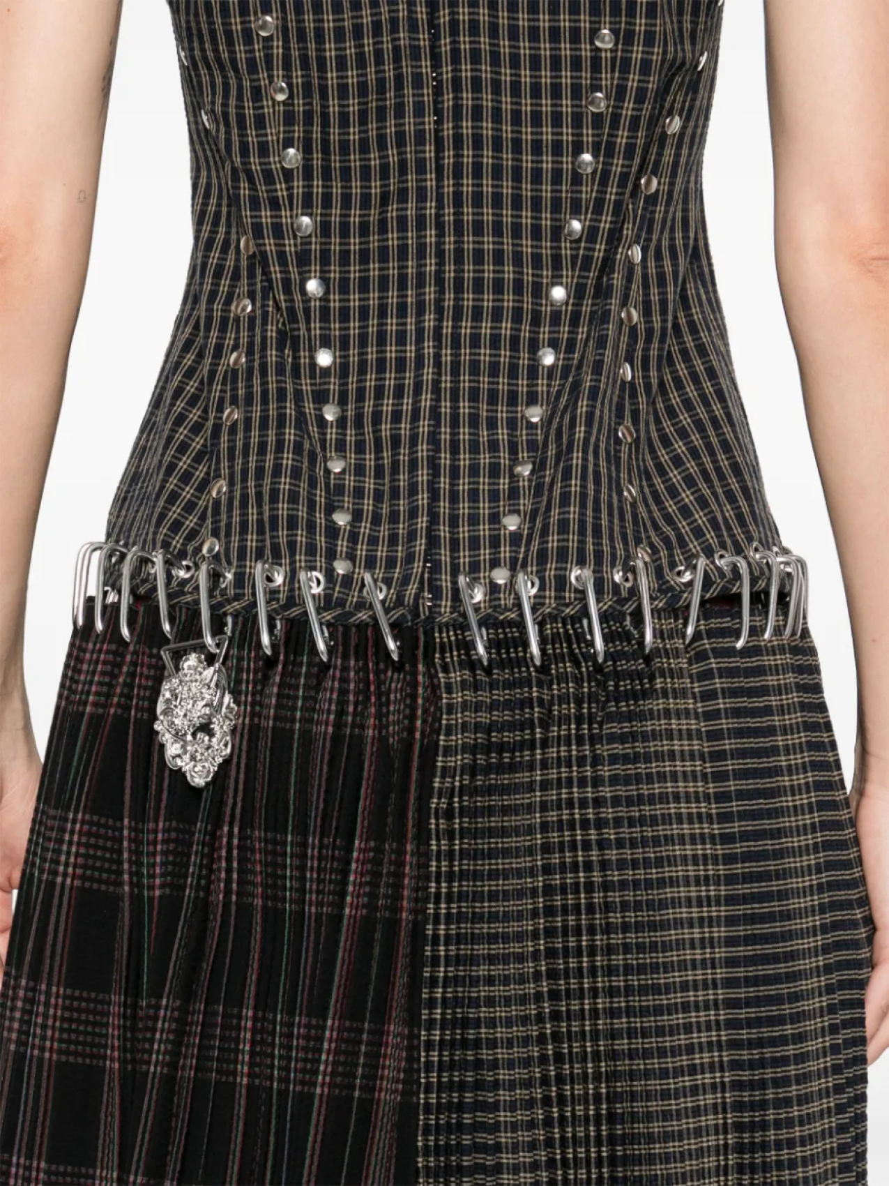 Темно-синего цвета, застежка на две пряжки, застежка на крючок и петельку спереди, лиф на косточках, плиссированная юбка