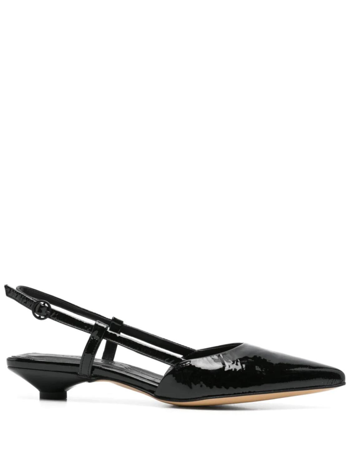 Черные туфли с застежкой-пряжкой, ремешок на пятке, фирменная кожаная стелька, вырезы, острый носок