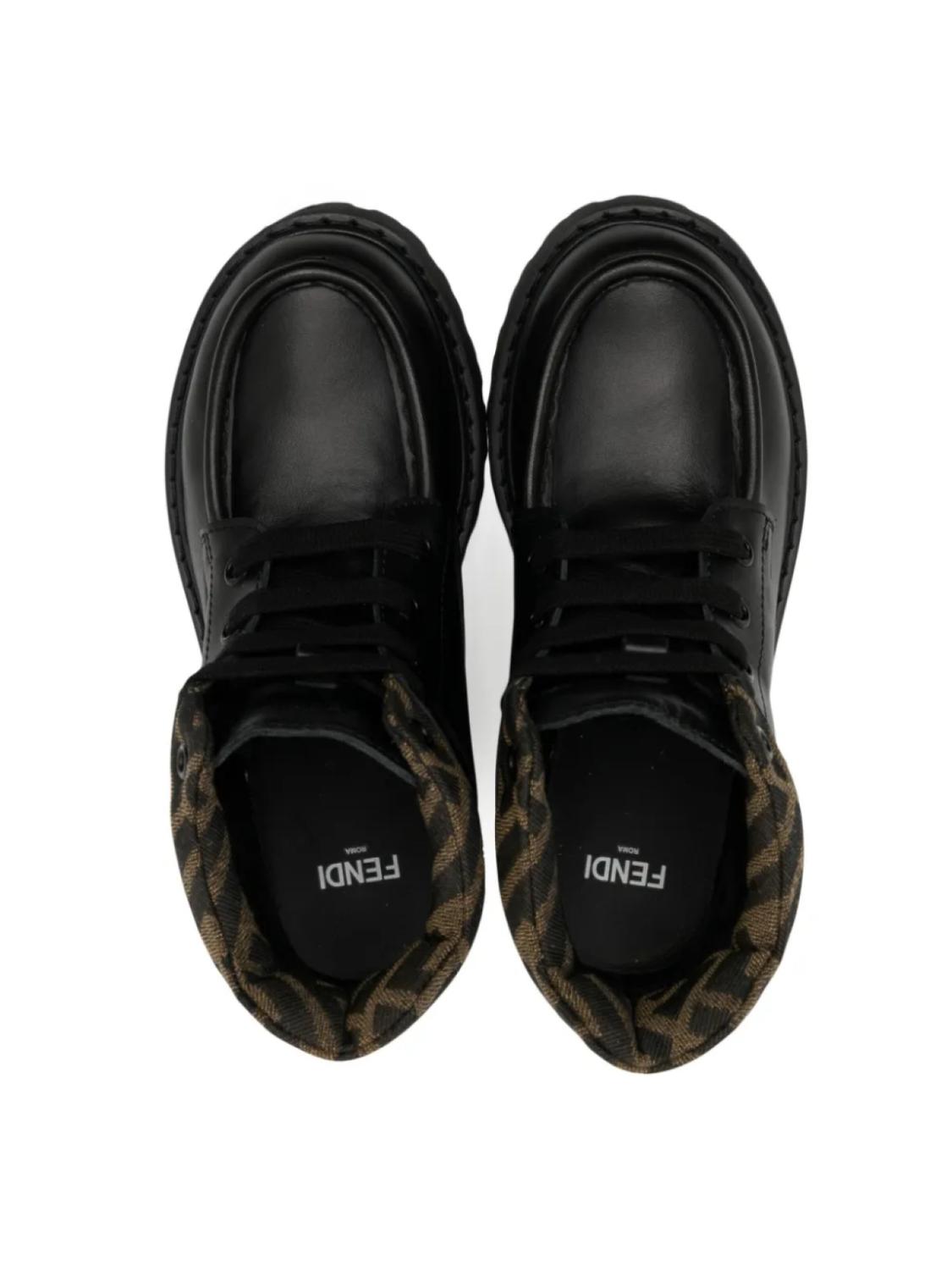 Черный, телячья кожа, принт с логотипом FF, тисненый логотип на язычке, строчка в тон, закругленный носок, шнуровка спереди, стелька с логотипом, рифленая резиновая подошва и высота по щиколотку.