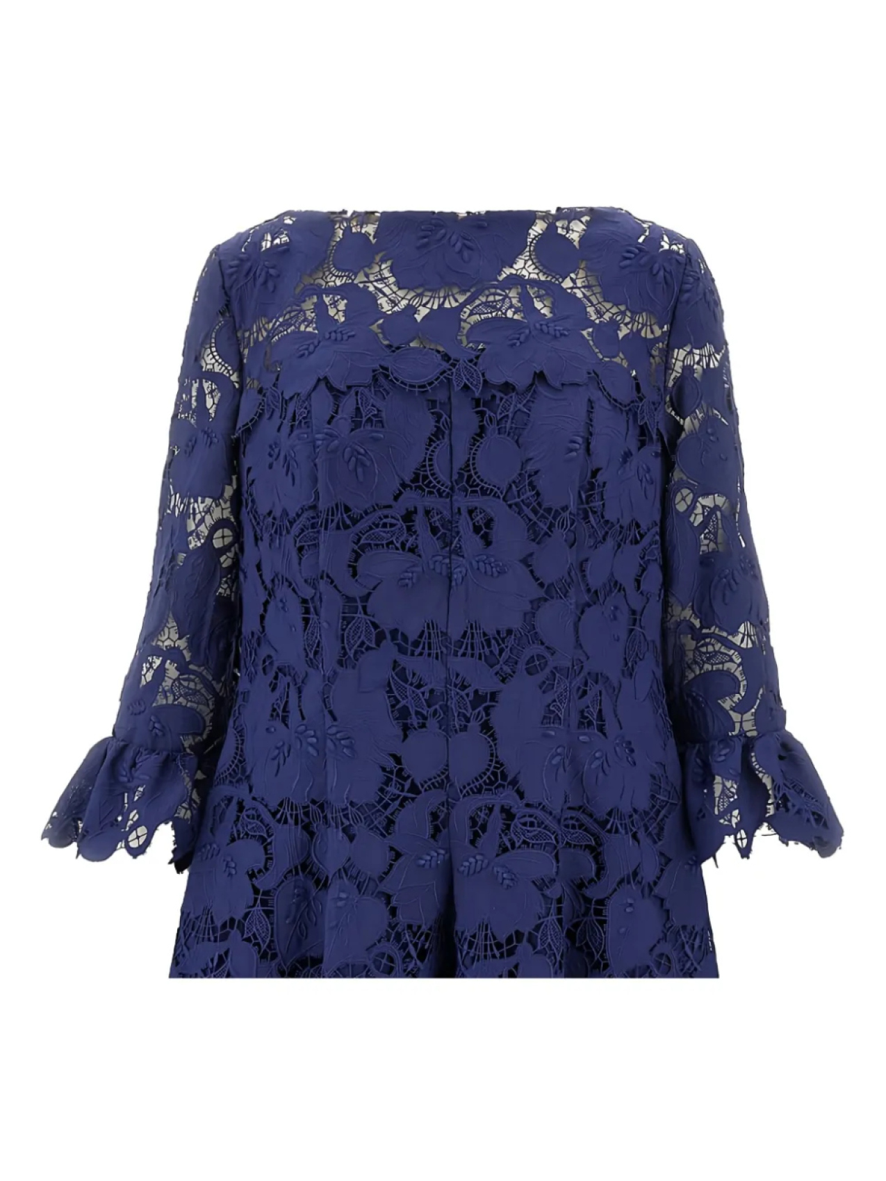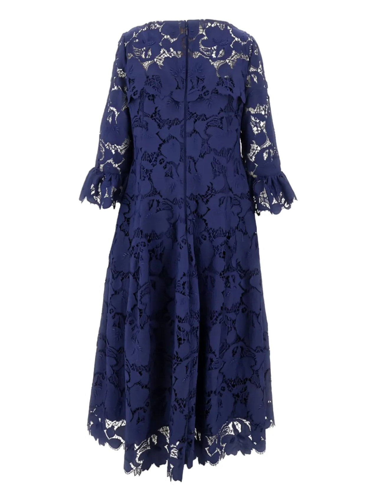 Темно-синий цветочный кружевной узор, рукава-колокольчики три четверти, застежка-молния сзади, фестончатый подол, расклешенная юбка