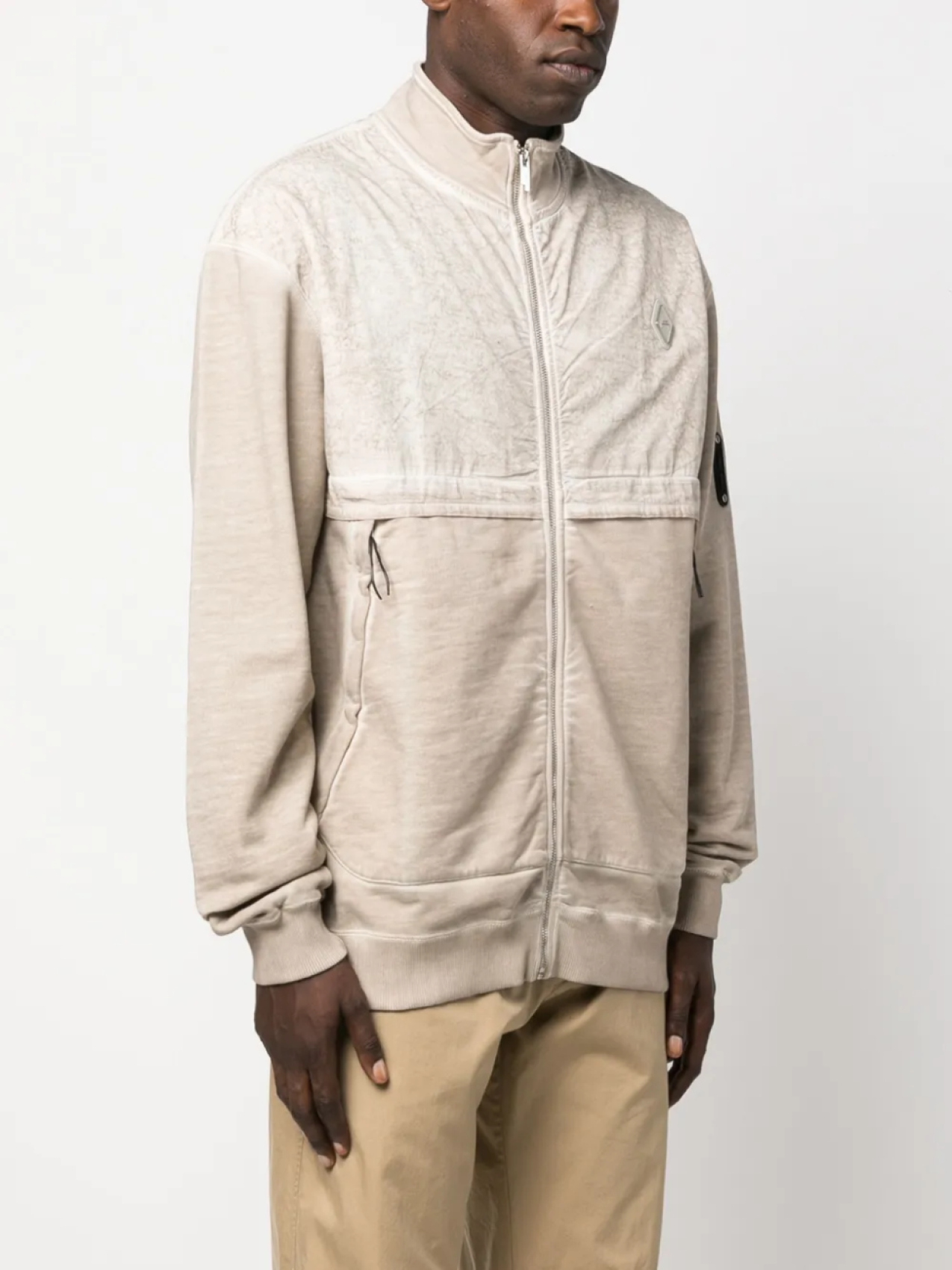 Светло-бежевый, хлопок, эффект потертости, стиль колор-блок, нашивка с логотипом на груди, нашивка с логотипом на рукаве, вышитый логотип сзади, воротник-стойка, двусторонняя молния спереди, приспущенные плечи, длинные рукава, два передних кармана и прямой подол.