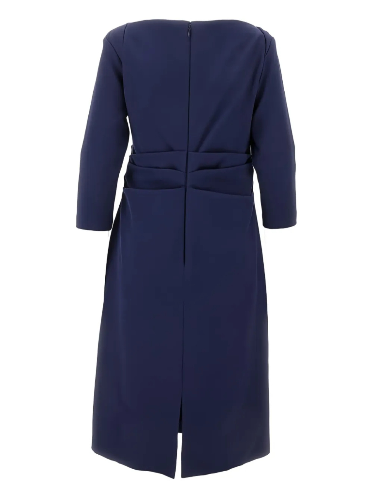 Темно-синий, с открытыми плечами, рукавами три четверти, потайной застежкой-молнией сзади, драпированными деталями, мягкой текстурой, боковыми сборками