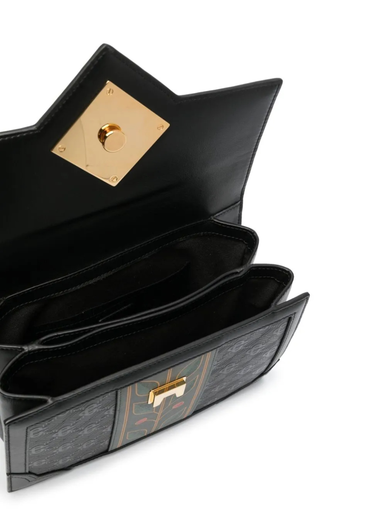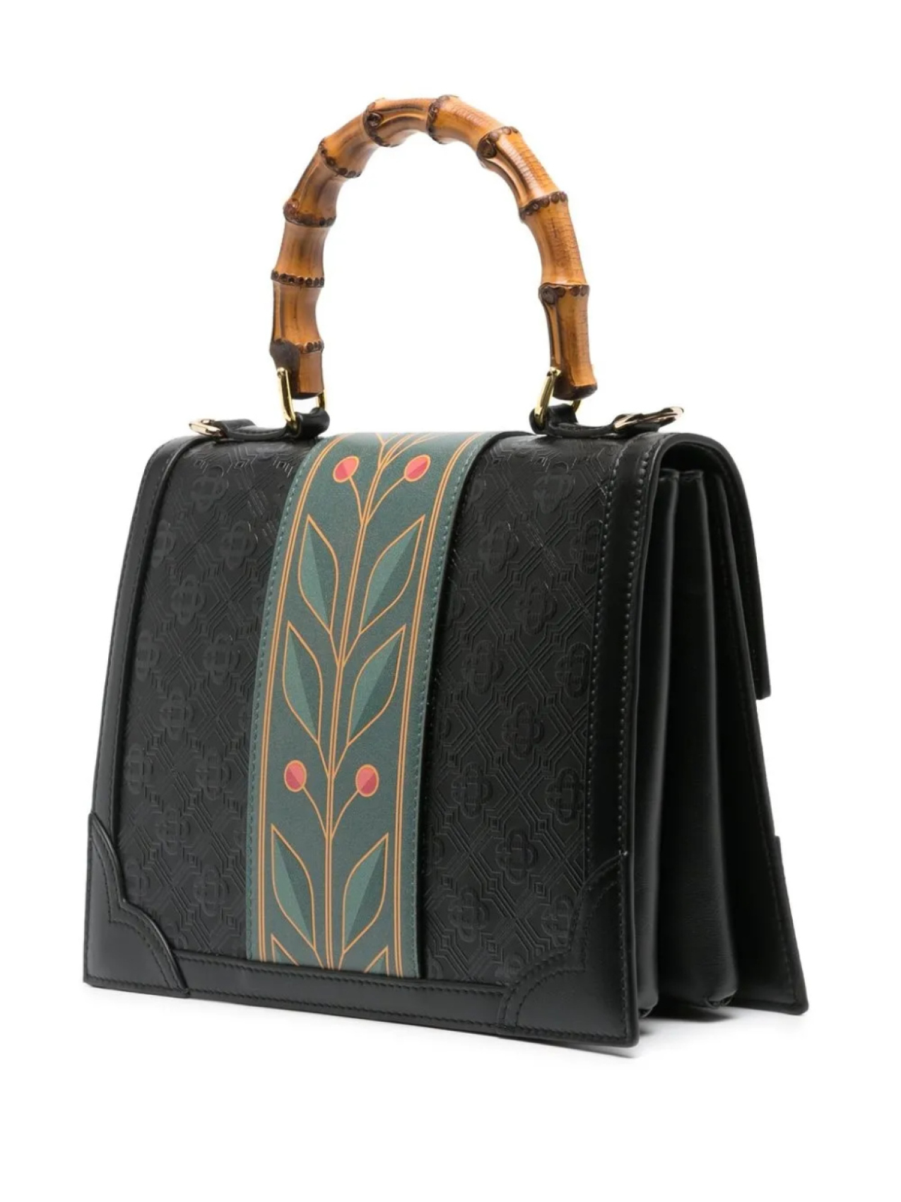 Черный/разноцветный, телячья кожа, нашивка с логотипом спереди, откидной клапан на магните, короткая ручка из бамбука, ремень на плечо и основное отделение.