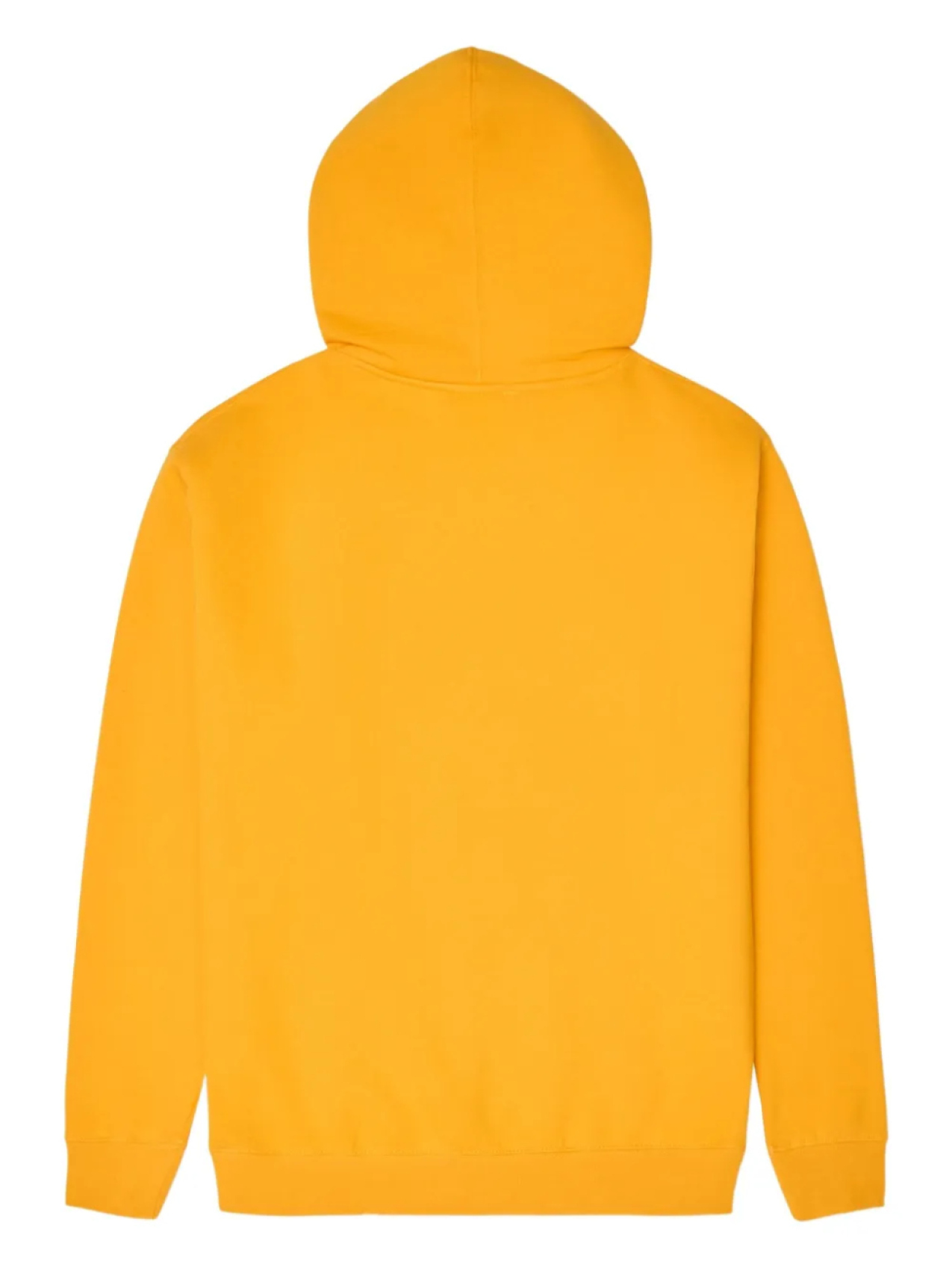 Горчично-желтый капюшон на завязках, передний карман-кенгуру, ребристые манжеты и подол, графический принт спереди