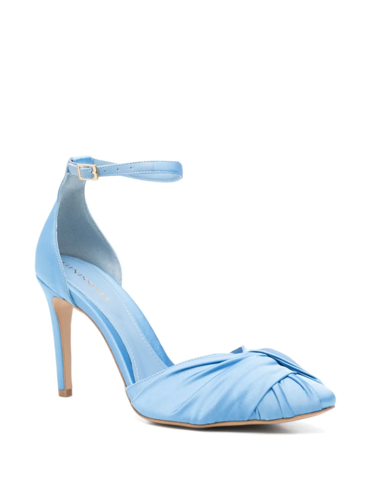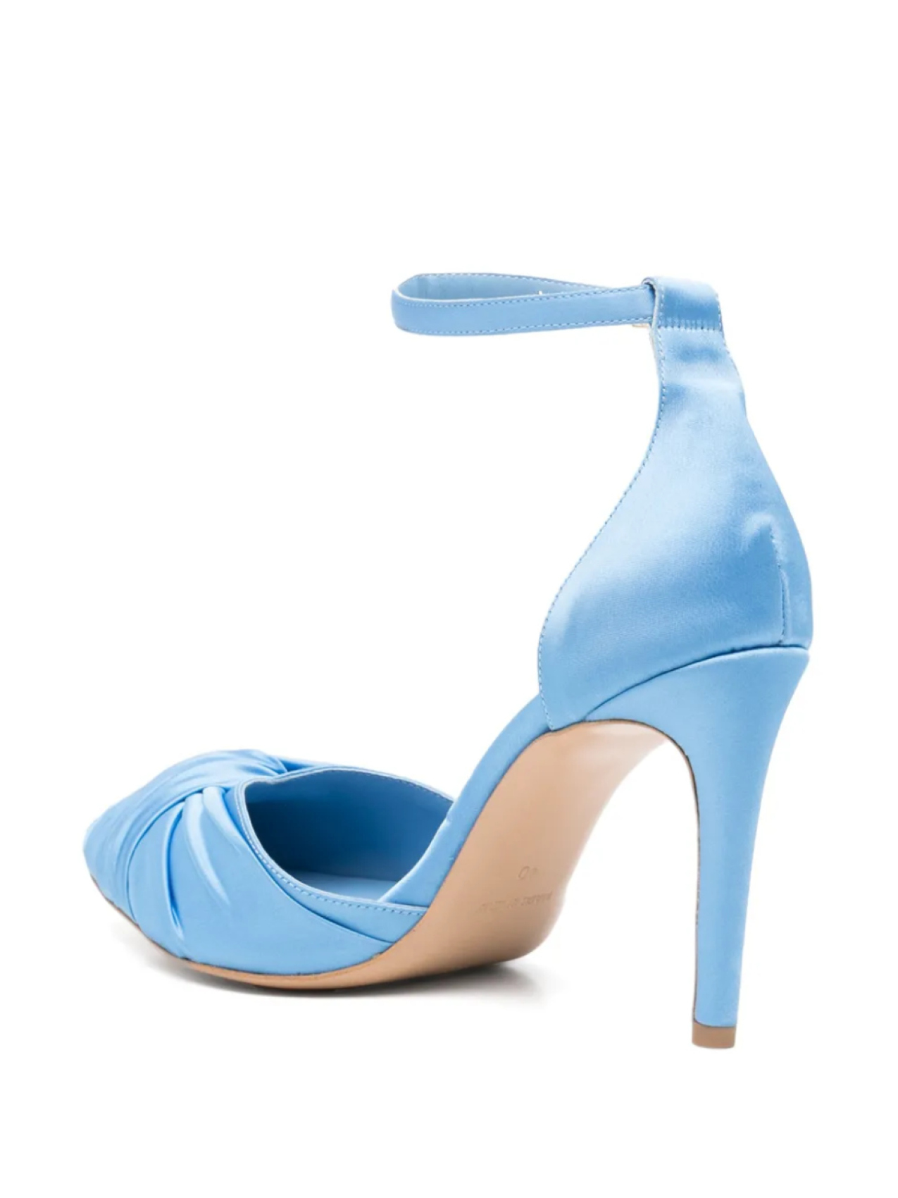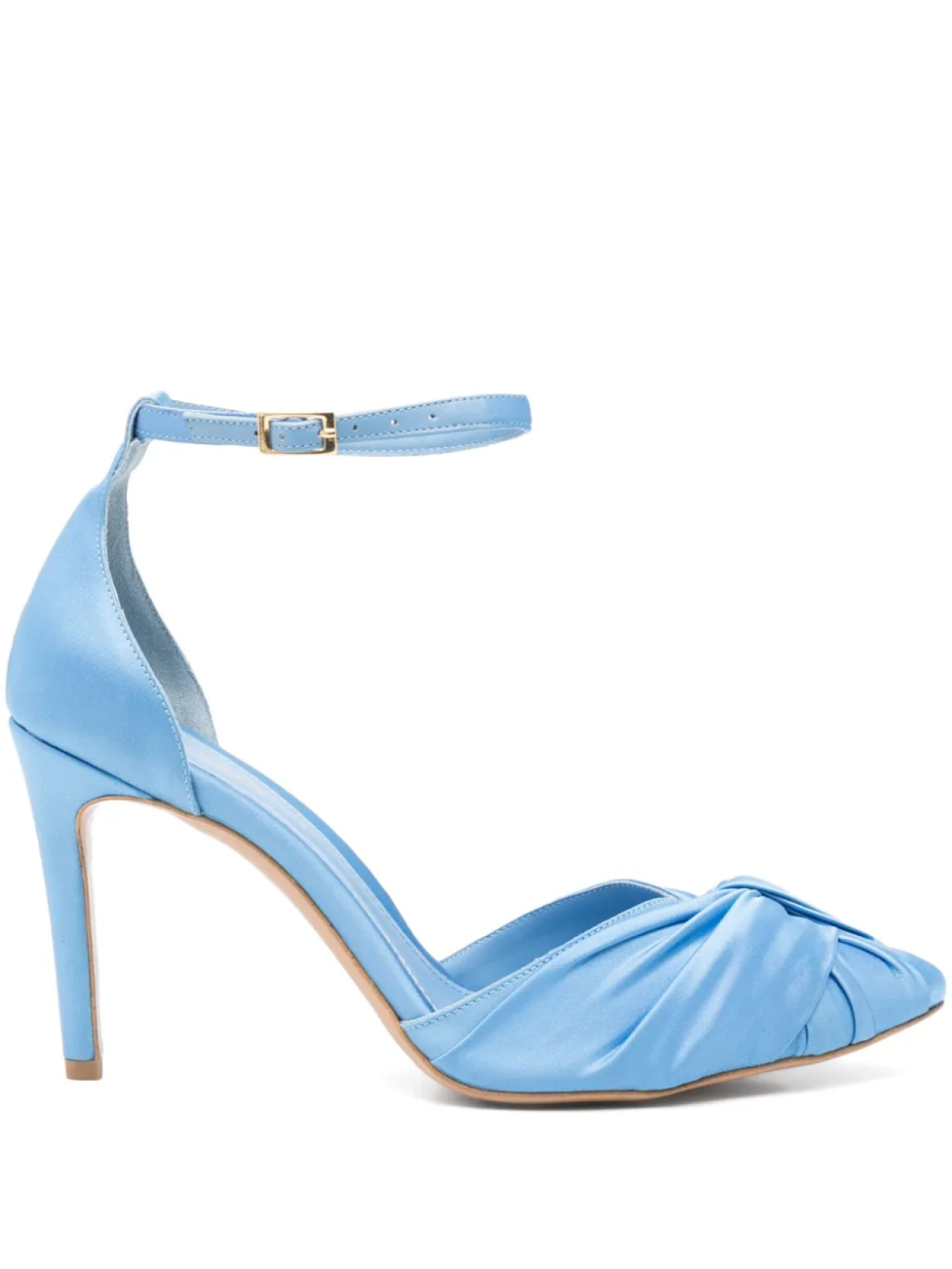 Небесно-голубой, с застежкой-пряжкой на щиколотке, с высоким каблуком-шпилькой, с заостренным носком и декоративным узлом
