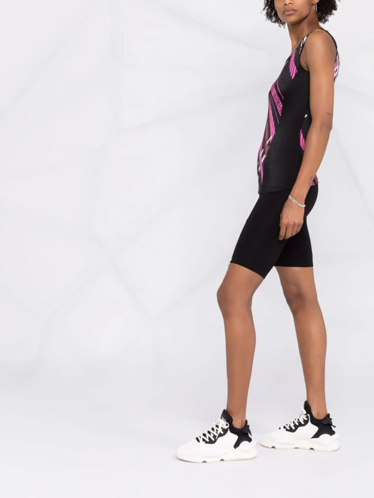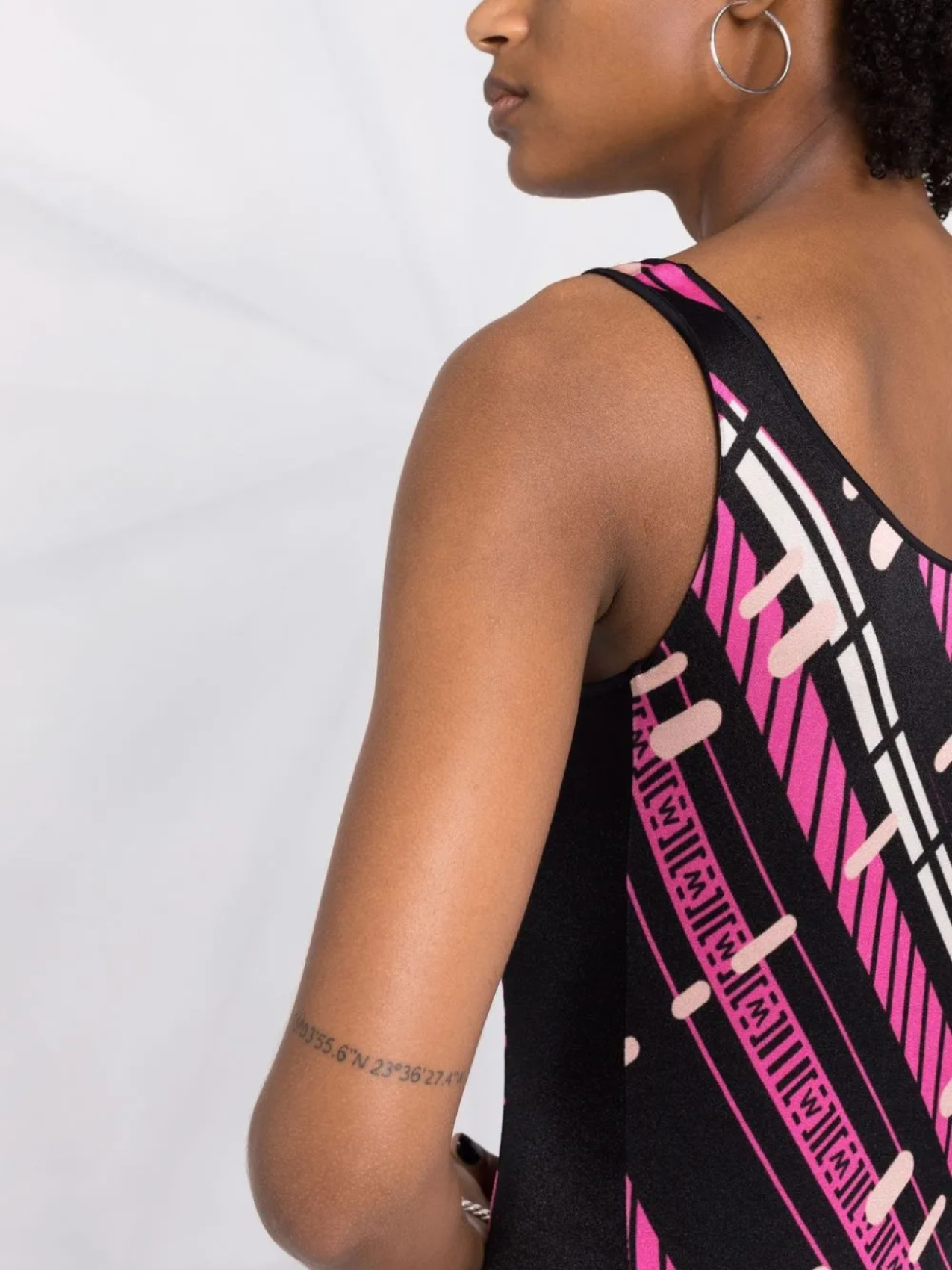Узор в полоску нескольких видов, U-образный вырез, без рукавов и tecido com stretch.