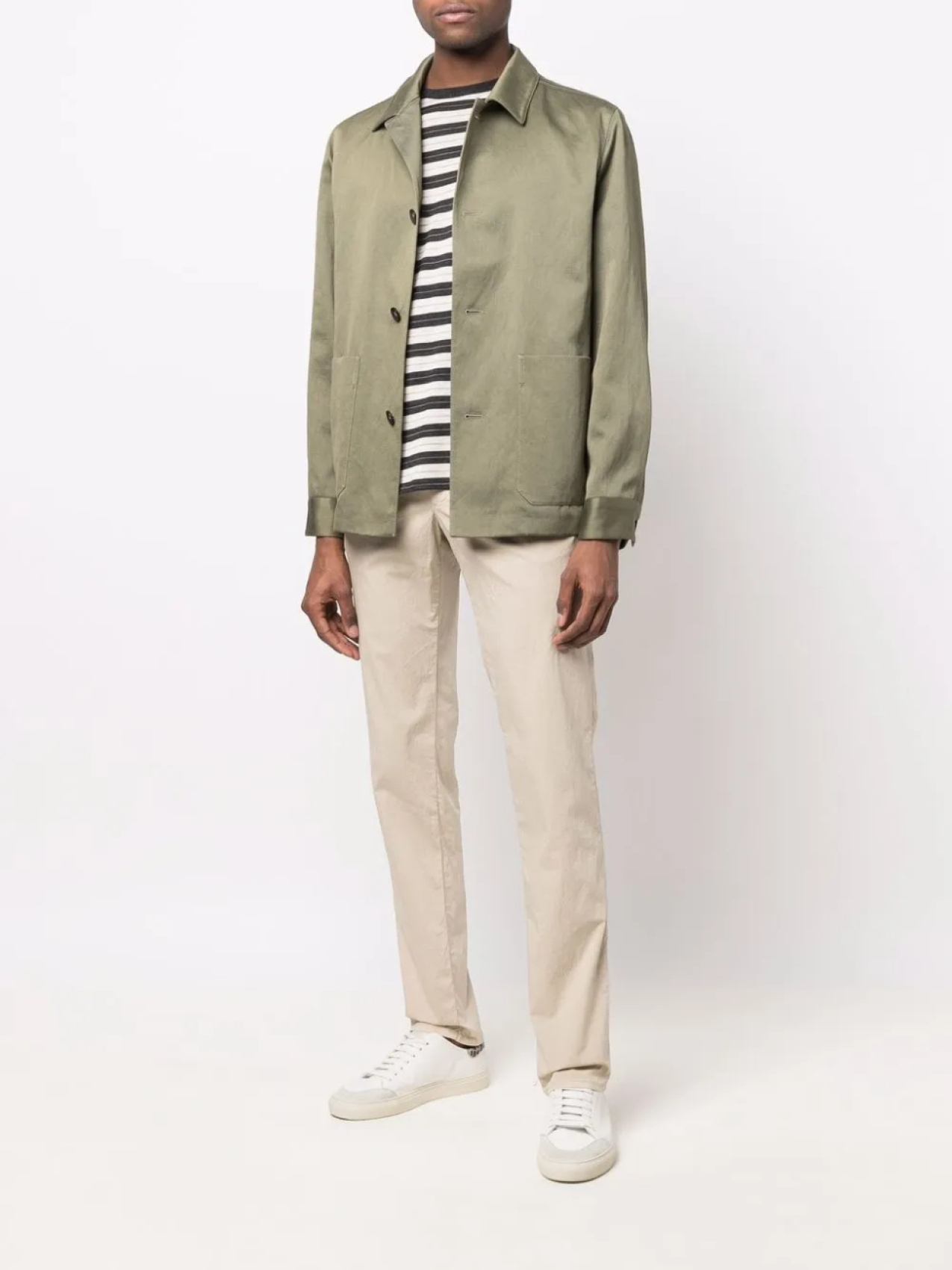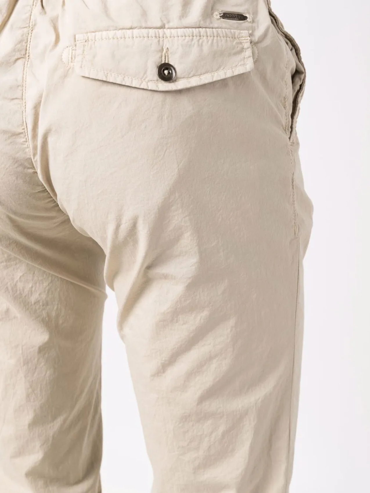 Два прорезных кармана по бокам, два кармана на пуговице сзади, нашивка с логотипом сзади, кулиска на талии, прямой крой и ширинка на молнии.