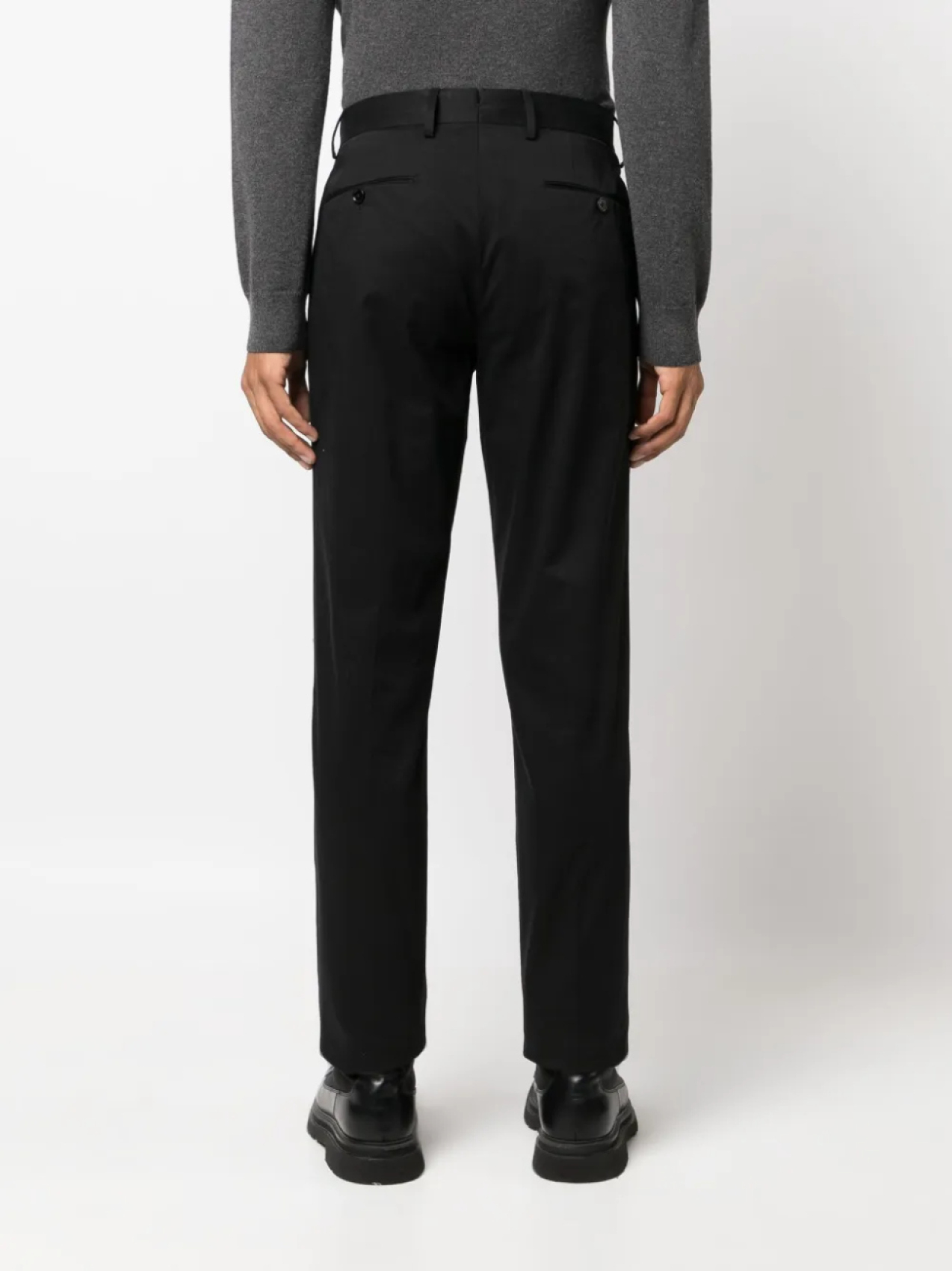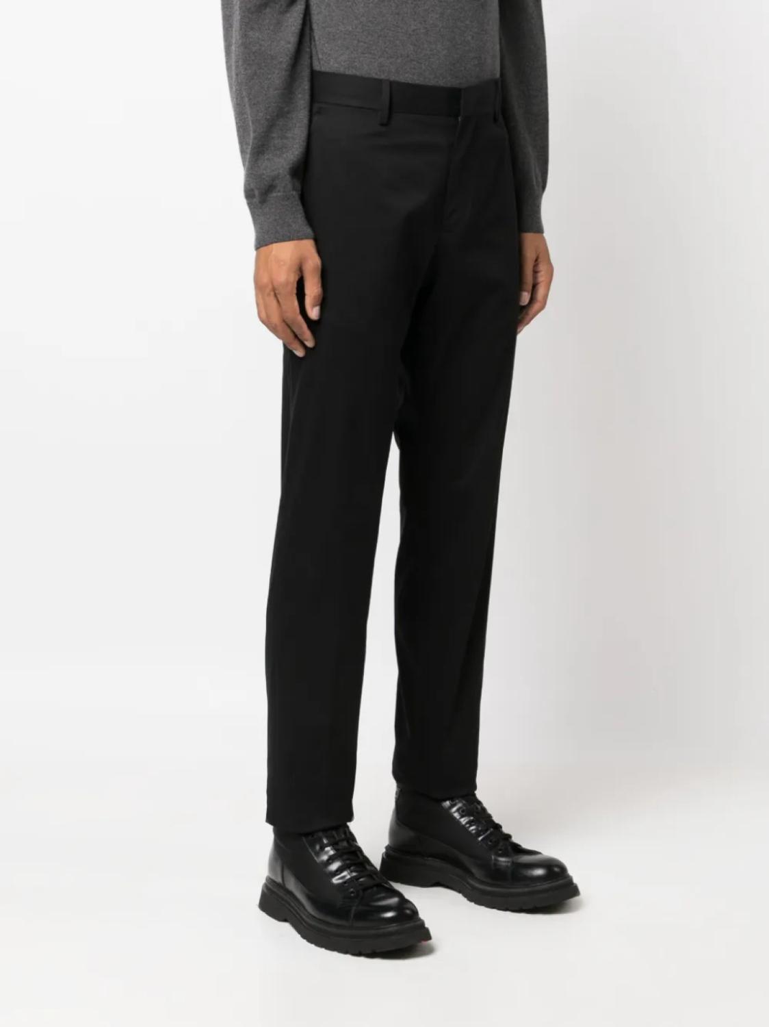 Черный, хлопок, эластичный хлопок, петли для ремня, застежка на молнии и пуговице спереди, прямой крой, два прорезных кармана по бокам и два кармана с листочкой сзади.