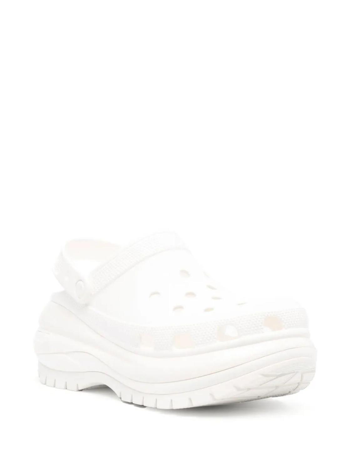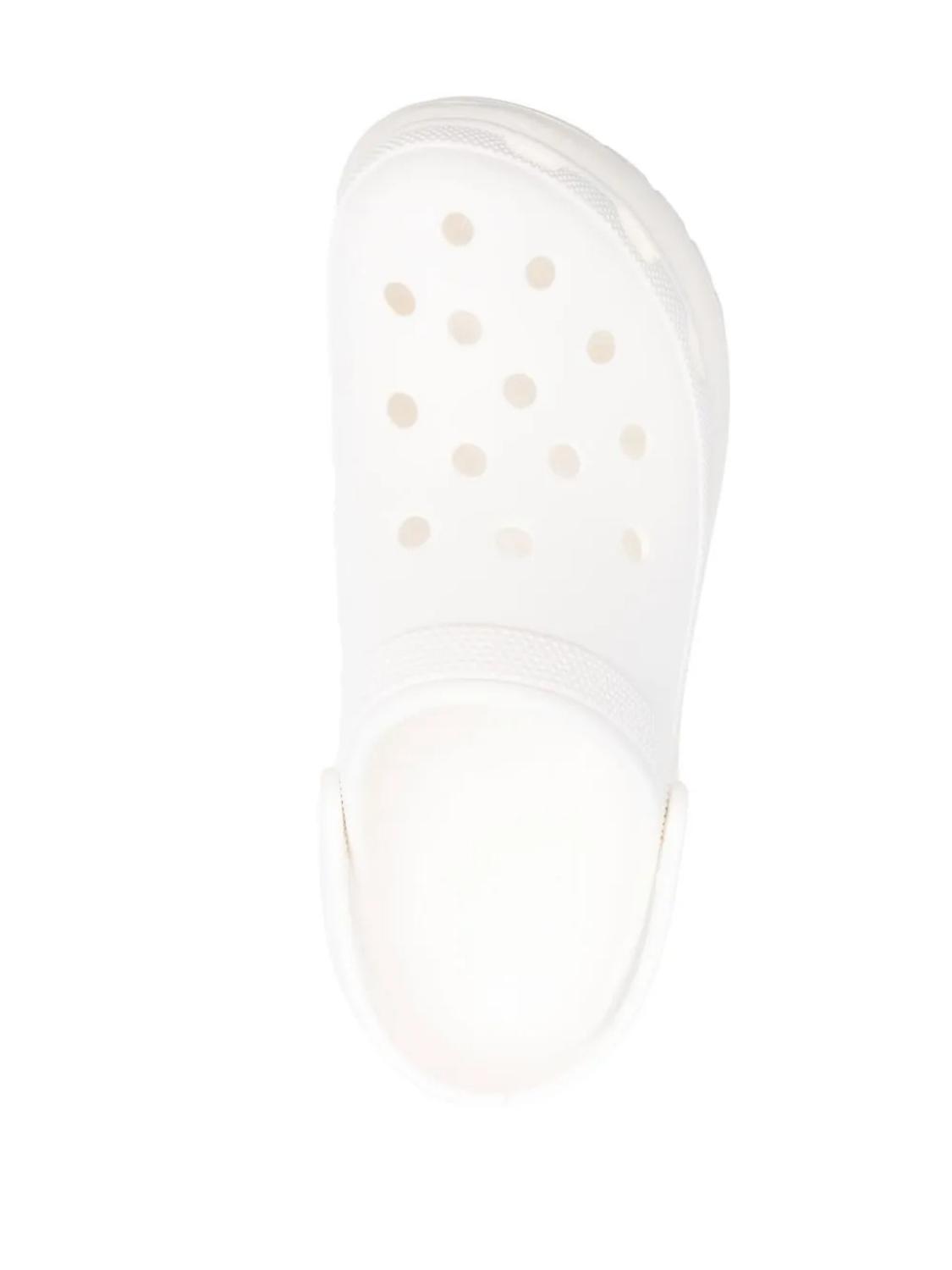 Белый, перфорированная модель, ремешок на пятке, подошва на платформе и резиновая подошва.