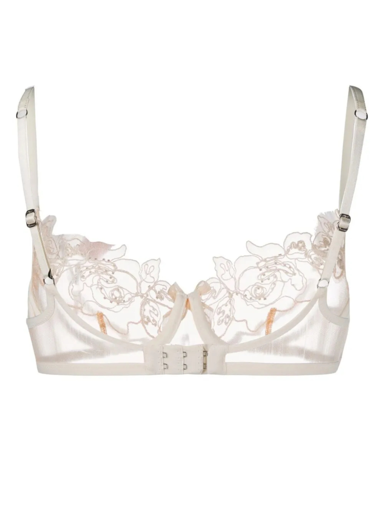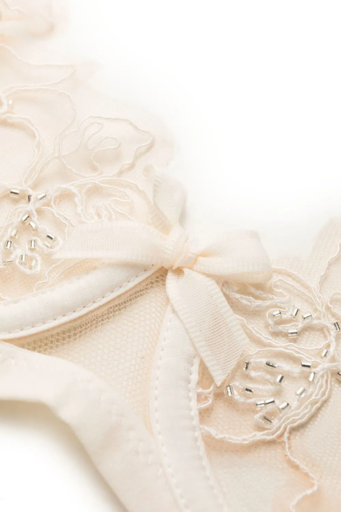 Цвет слоновой кости, вставки из цветочного кружева, края с фестонами, чашка на косточках и регулируемые лямки.