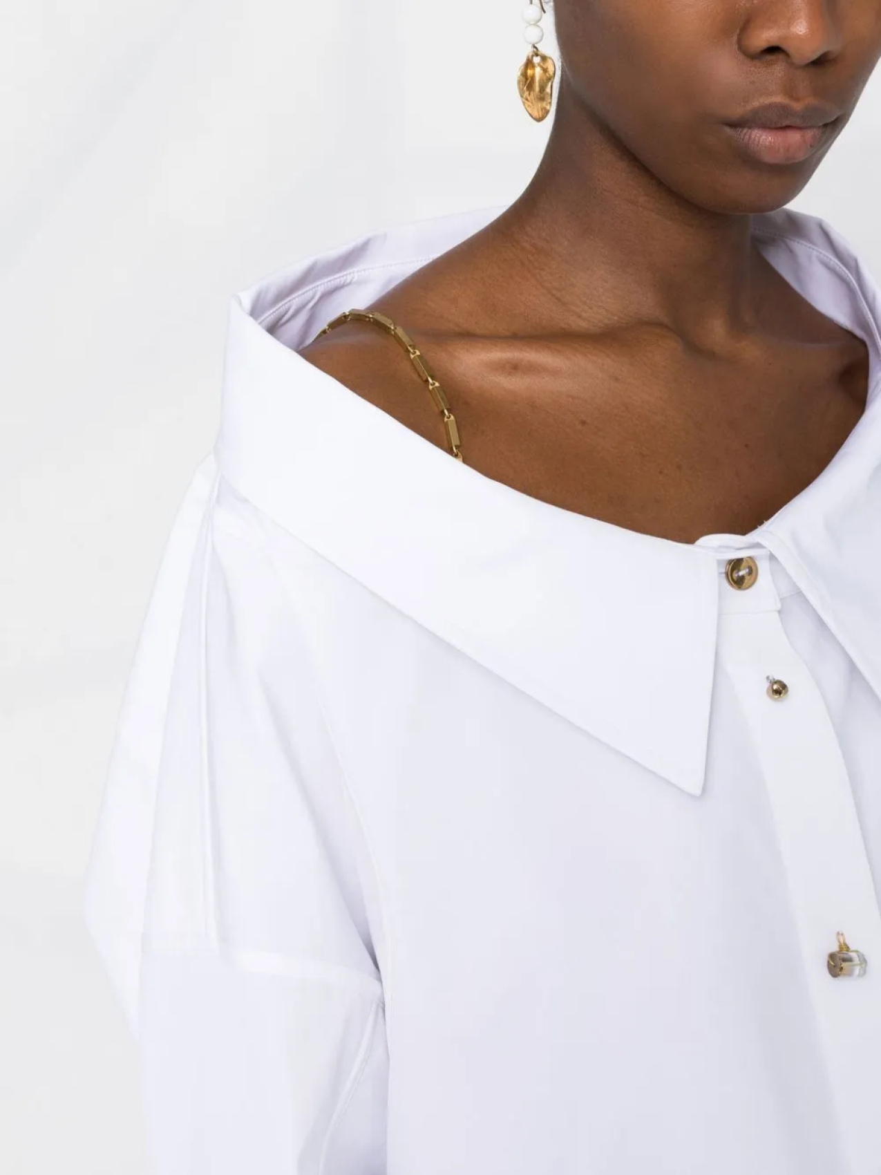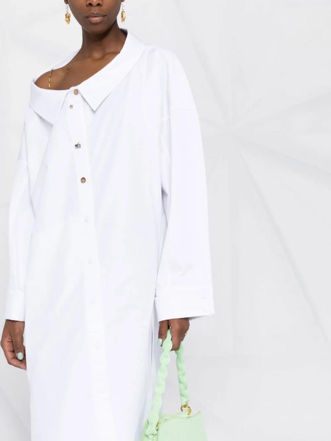 Круглый вырез, тонкие бретели, застежка на пуговицах спереди, асимметричный подол, боковые разрезы, приспущенные плечи и рукава с манжетами на пуговицах. Цвет: белый.