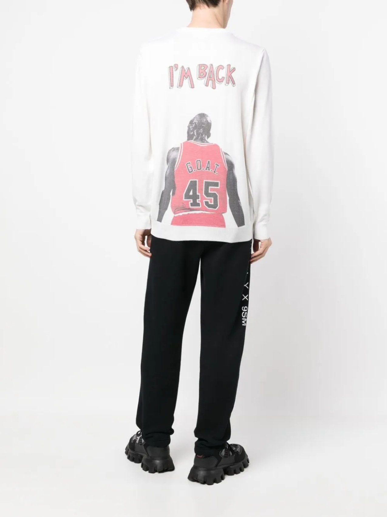 Белый/черный, красный, смесовая шерсть мериноса, логотип в технике интарсия, графичный принт на спине, круглый вырез, длинные рукава и прямой подол.