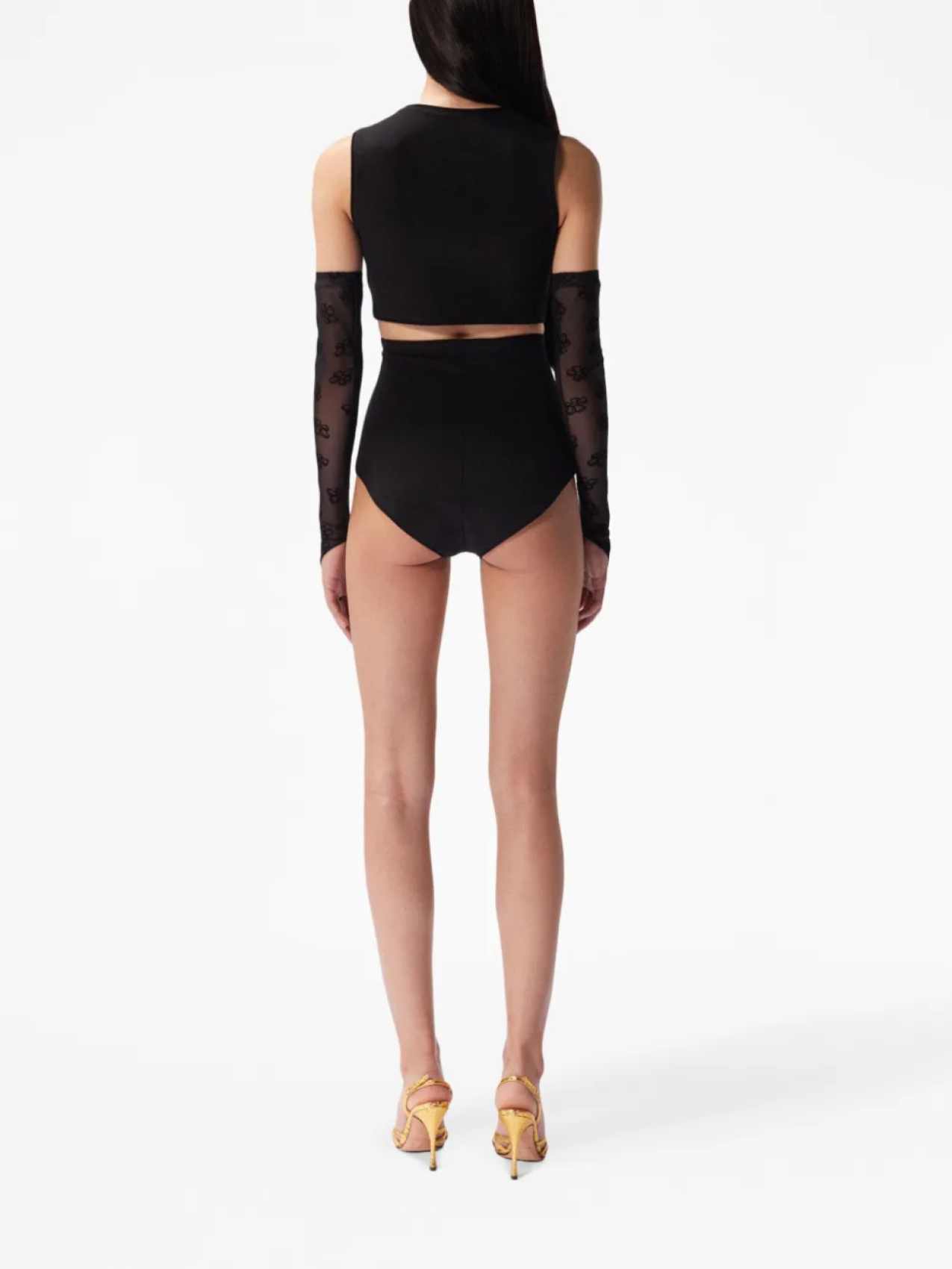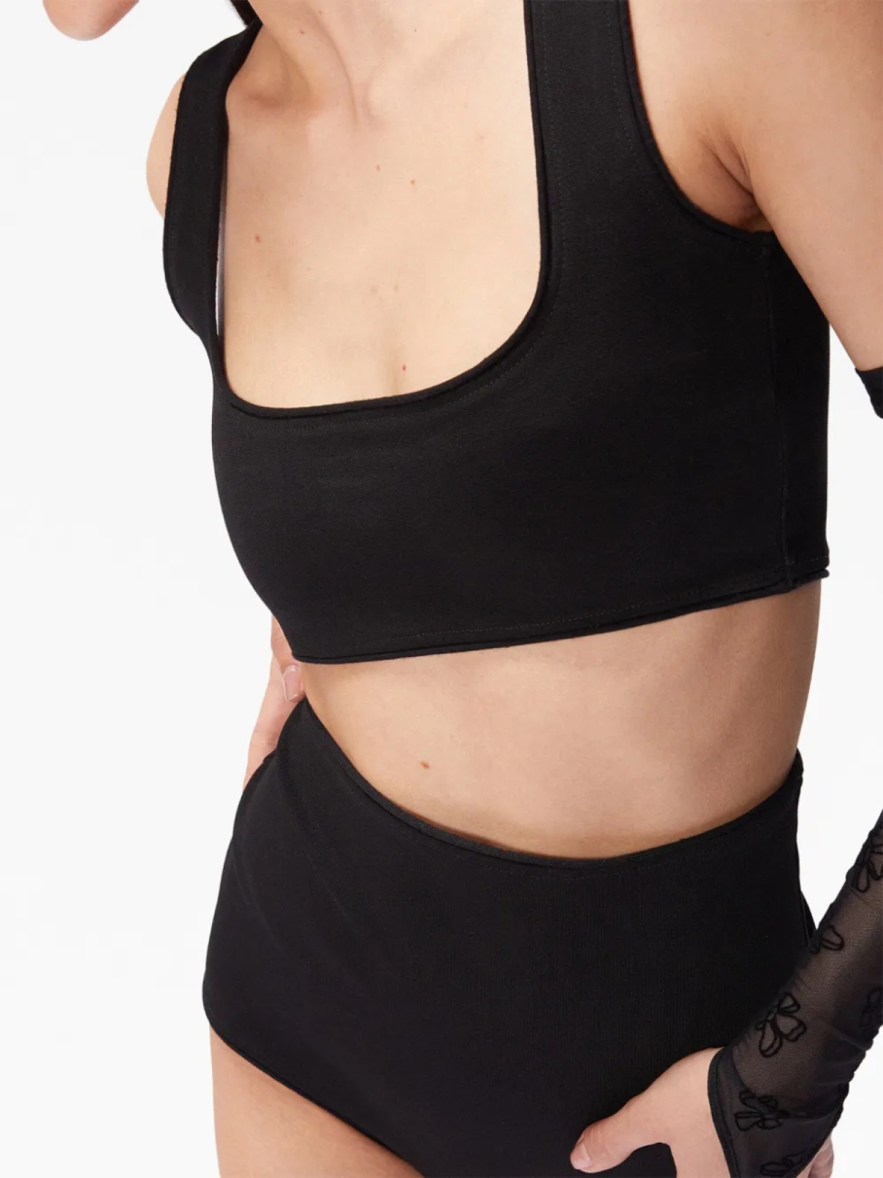 Черный, эластичный материал, квадратный вырез, без рукавов, прямой подол и укороченная длина.