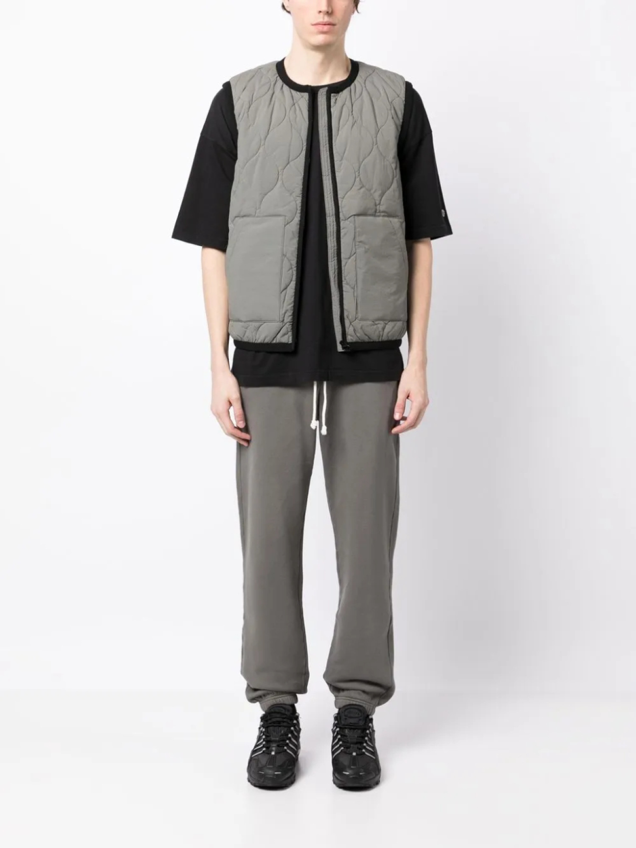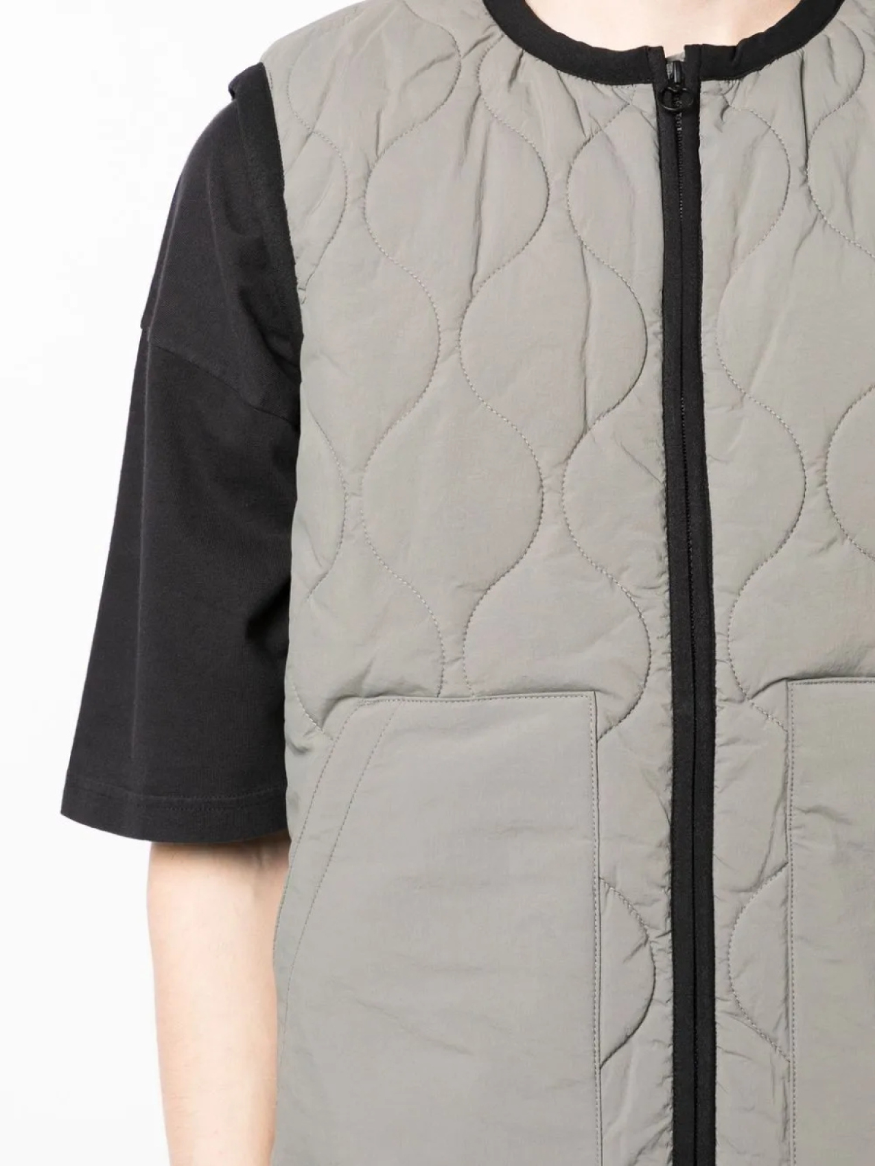 Шиферно-серый, стеганая отделка, контрастная отделка, застежка на молнии спереди, круглый вырез, без рукавов и два накладных кармана по бокам.