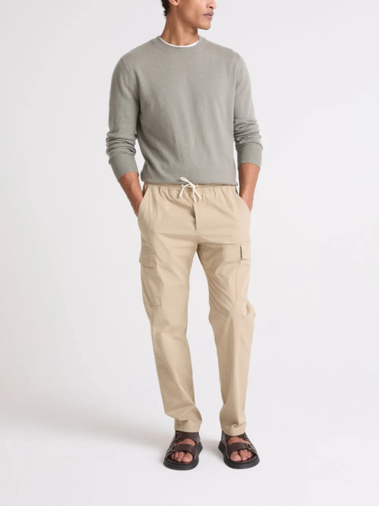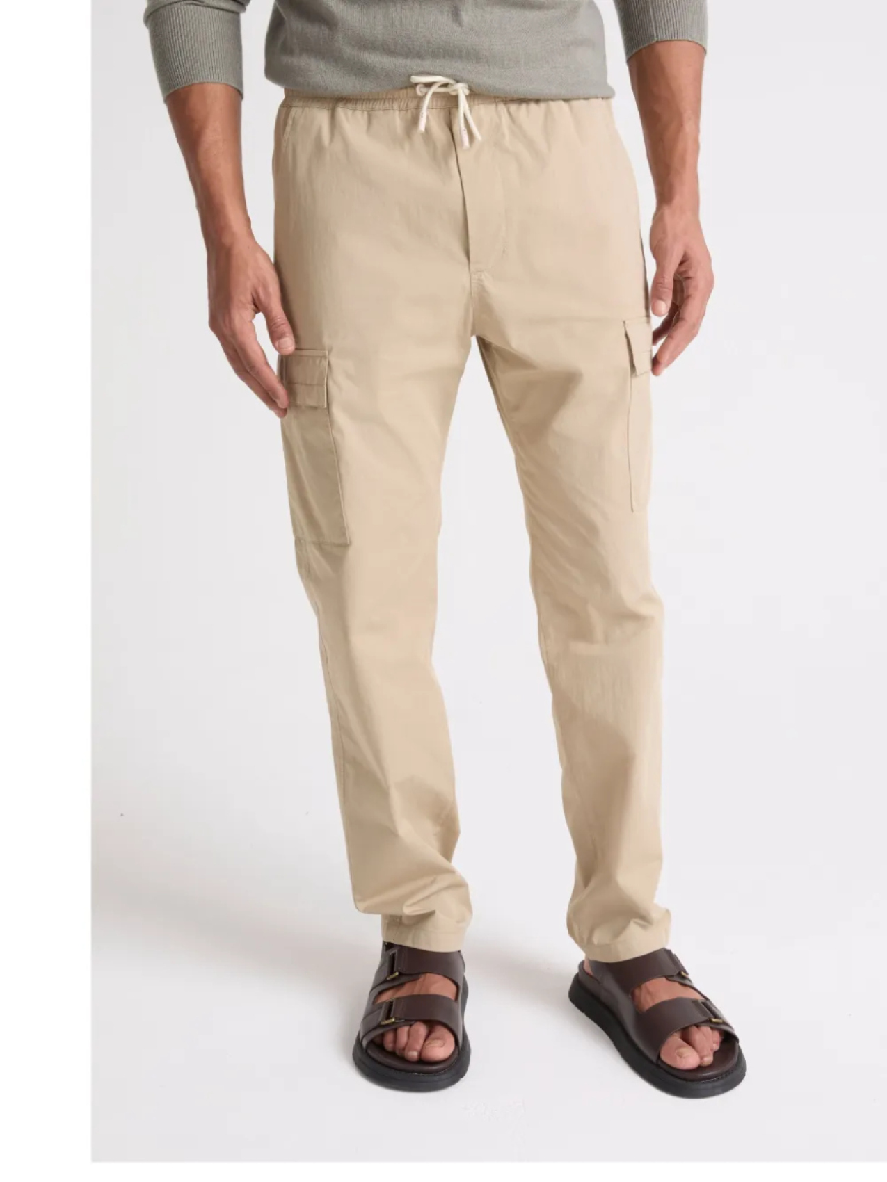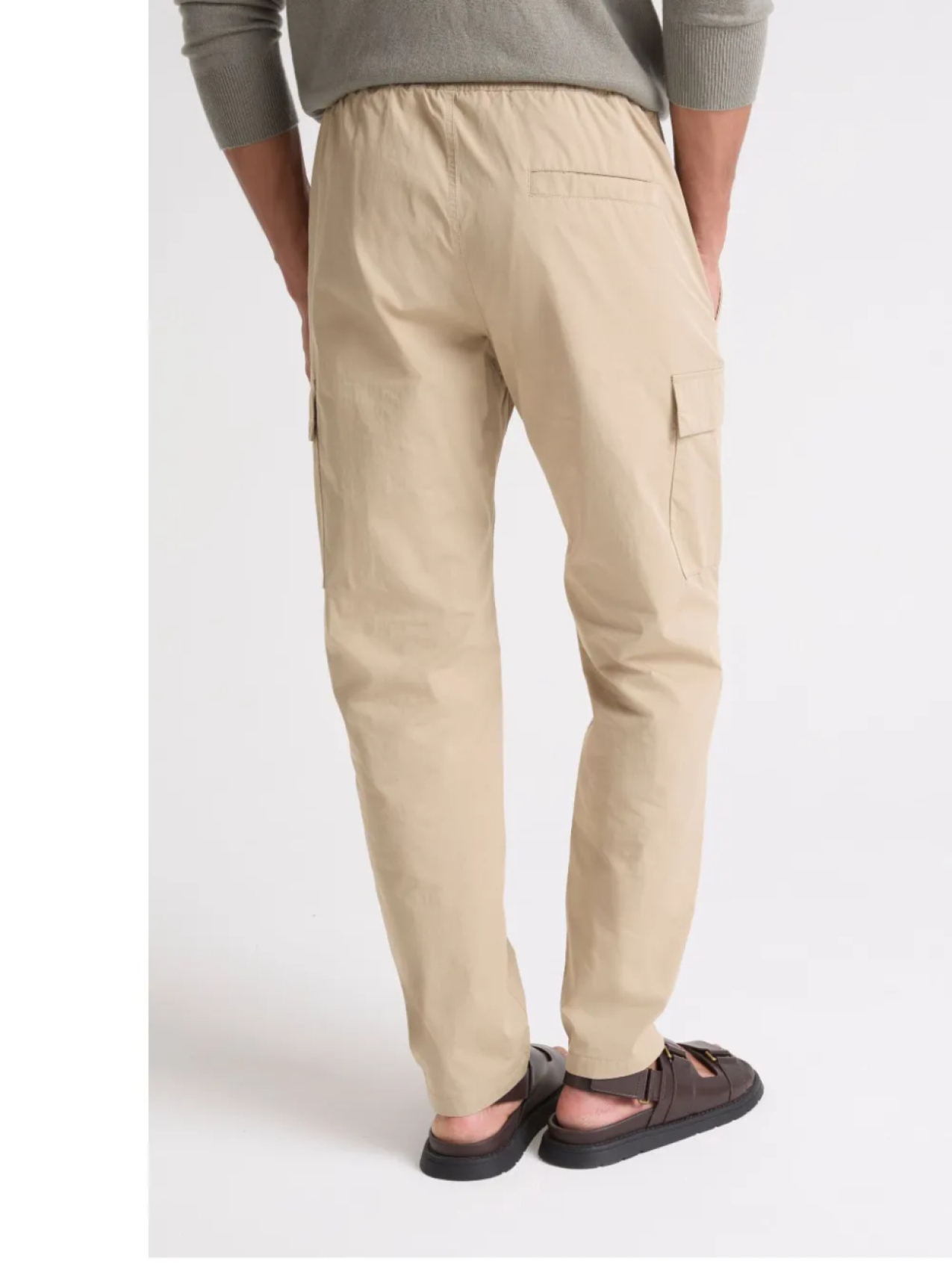 Песочно-бежевый эластичный пояс со шнурком, два прорезных кармана по бокам, два боковых кармана-карго, эластичные лодыжки