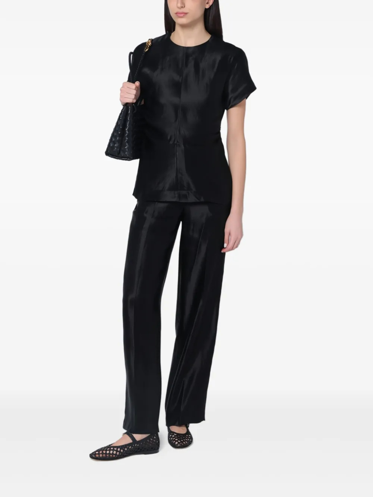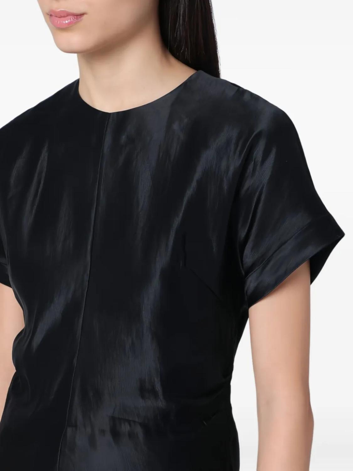 Черная потайная застежка-молния сзади, круглый вырез, короткие рукава, прямой подол