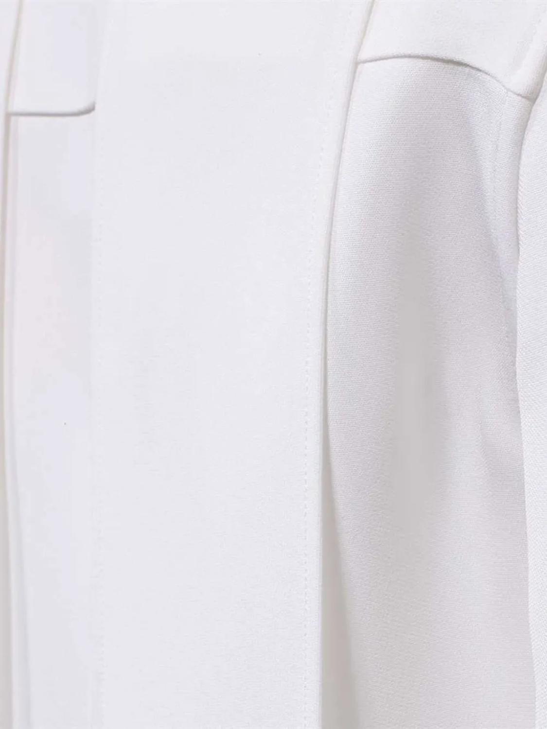 Белый, высокий воротник, завязка на бант сзади, потайная пуговичная застежка спереди, длинные рукава, манжеты на пуговицах и прямой подол.