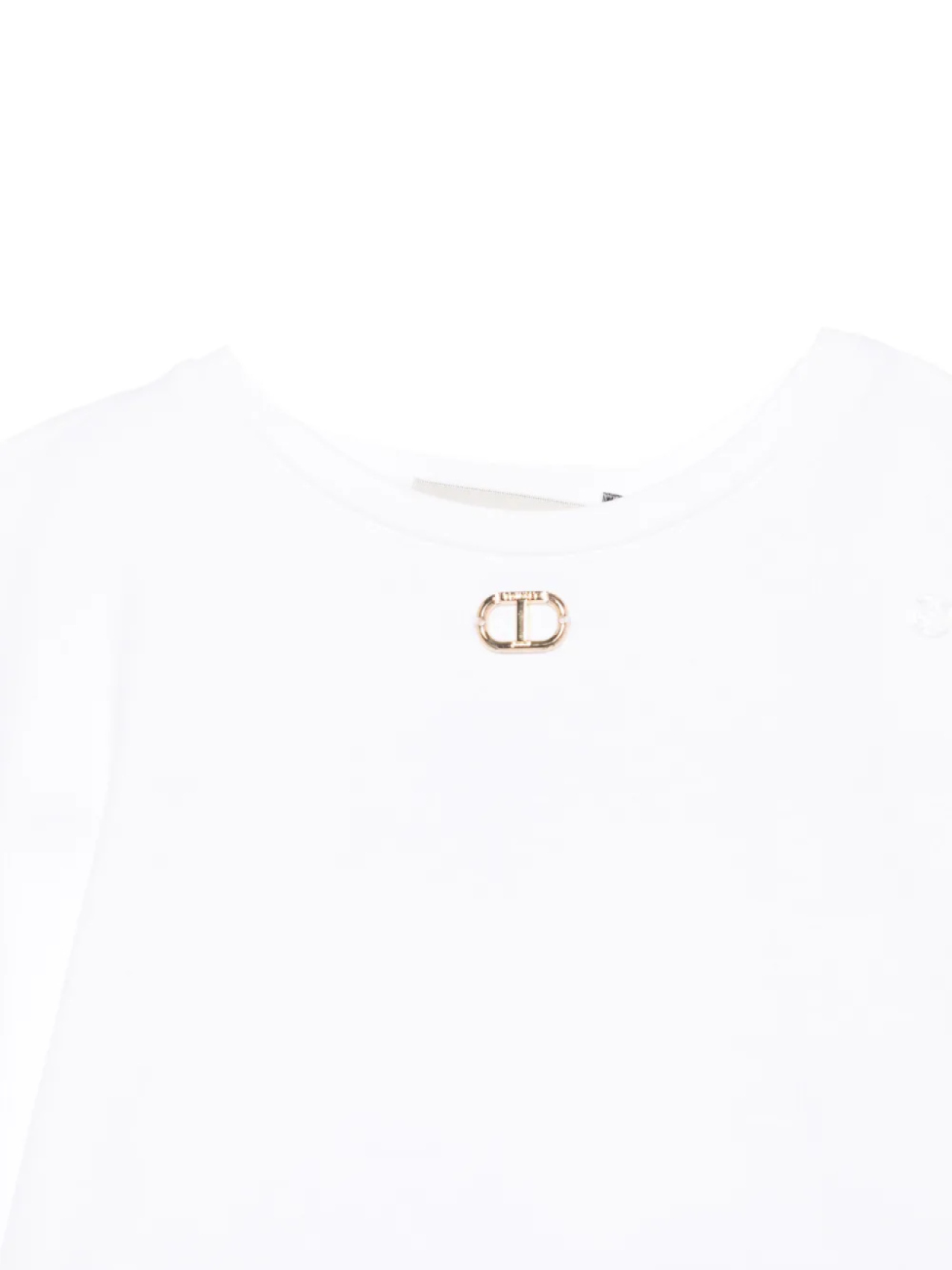 Белый эластичный пояс, круглый вырез горловины, золотистая пластинка с логотипом