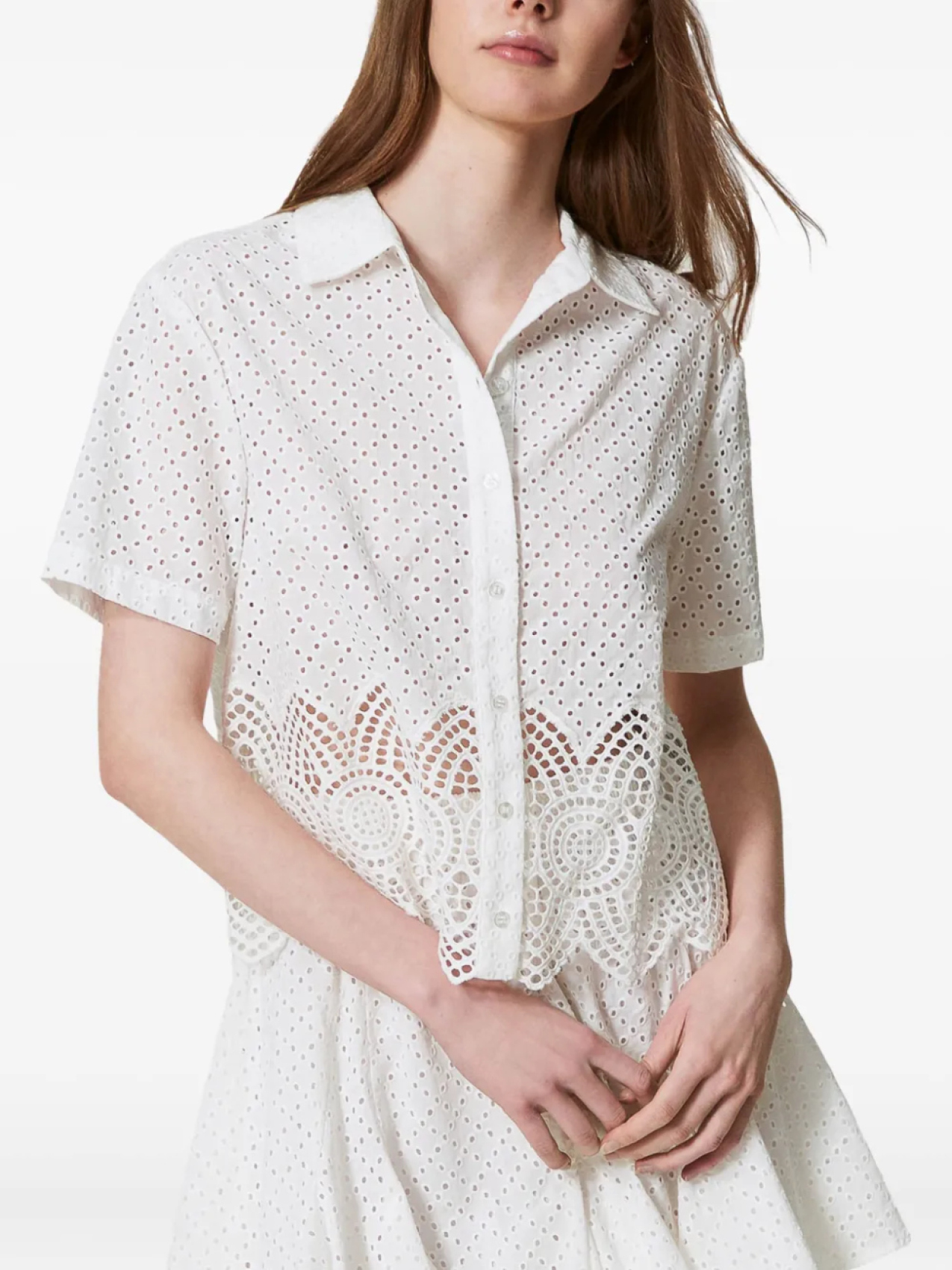 Белая застежка на пуговицы спереди, вышивка ришелье, вырезы, короткие рукава