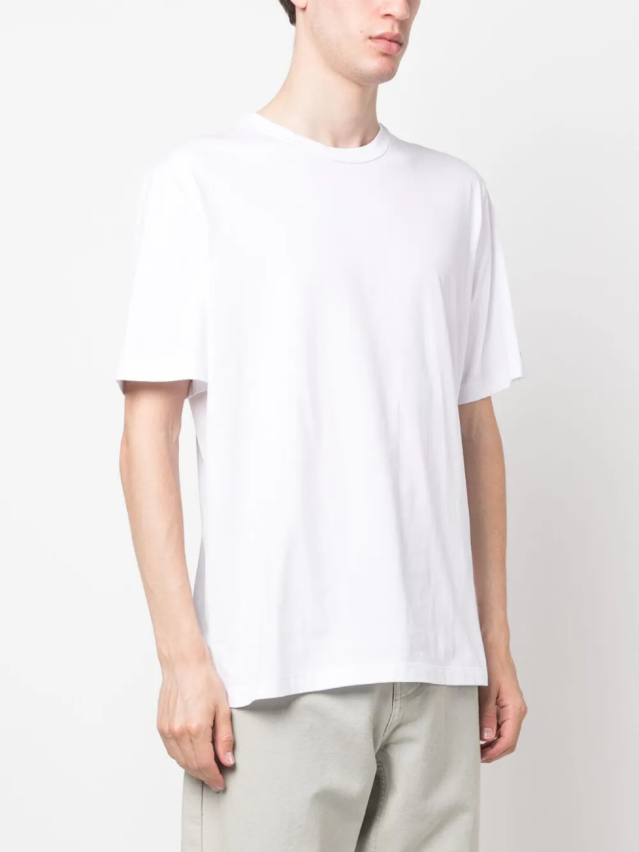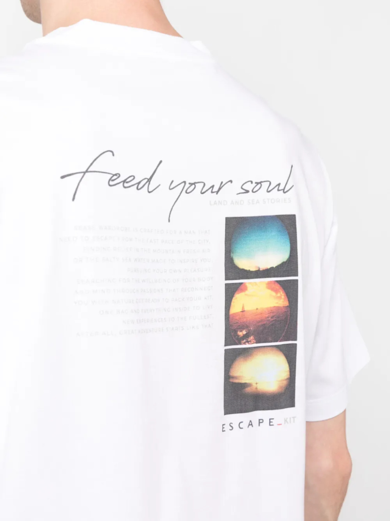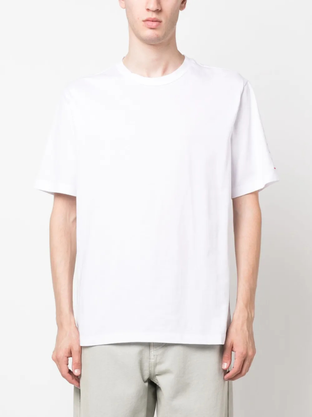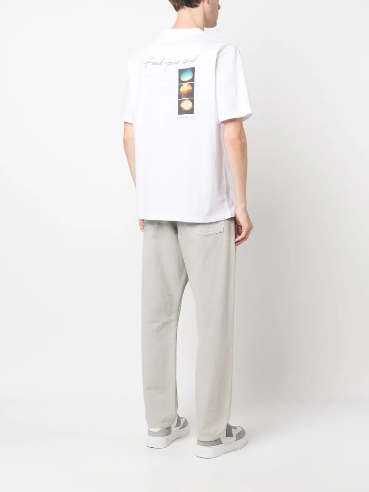 Белый, эластичный хлопок, принт с логотипом на рукаве, графичный принт на спине, принт с надписью сзади, круглый вырез, короткие рукава и прямой подол.