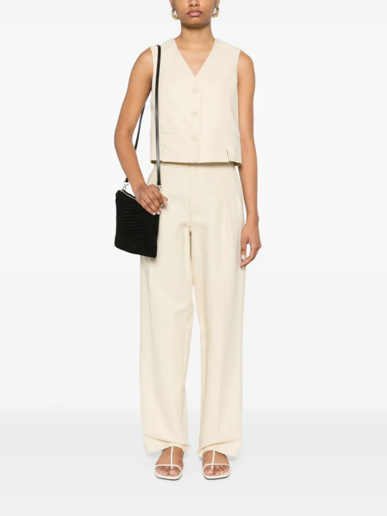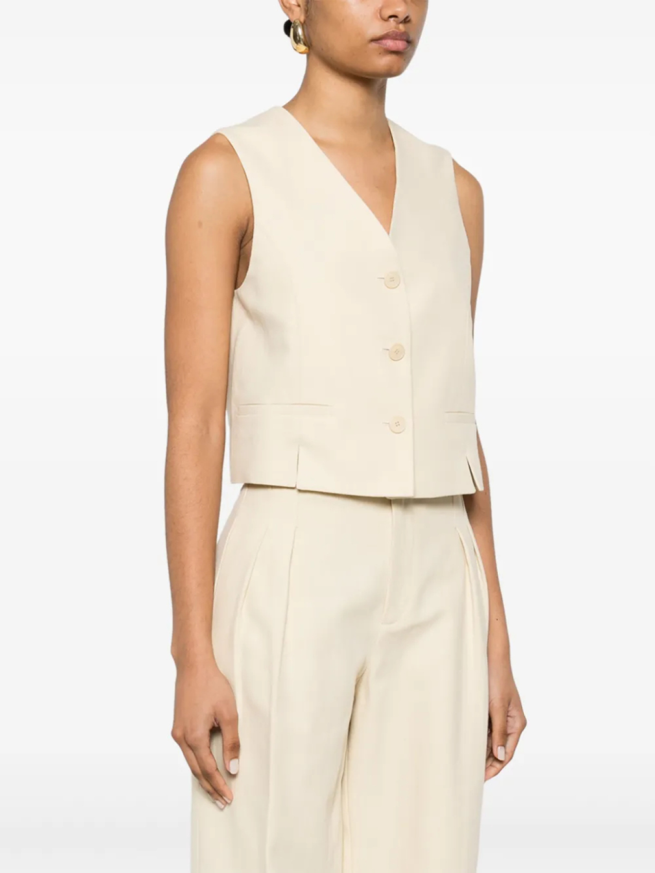 Светло-бежевый, застежка на пуговицы спереди, разрез спереди, V-образный вырез, без рукавов