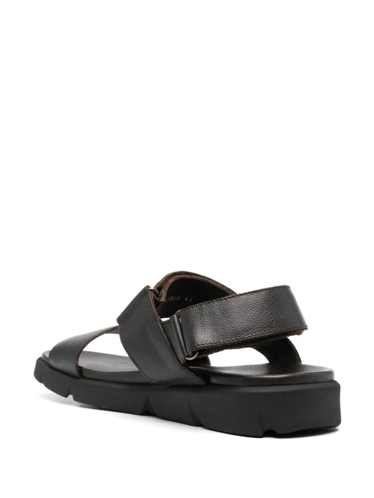Темно-коричневый, кожа, кожаная подкладка, стелька с логотипом, открытый носок, застежка на липучке спереди и ребристая резиновая подошва.