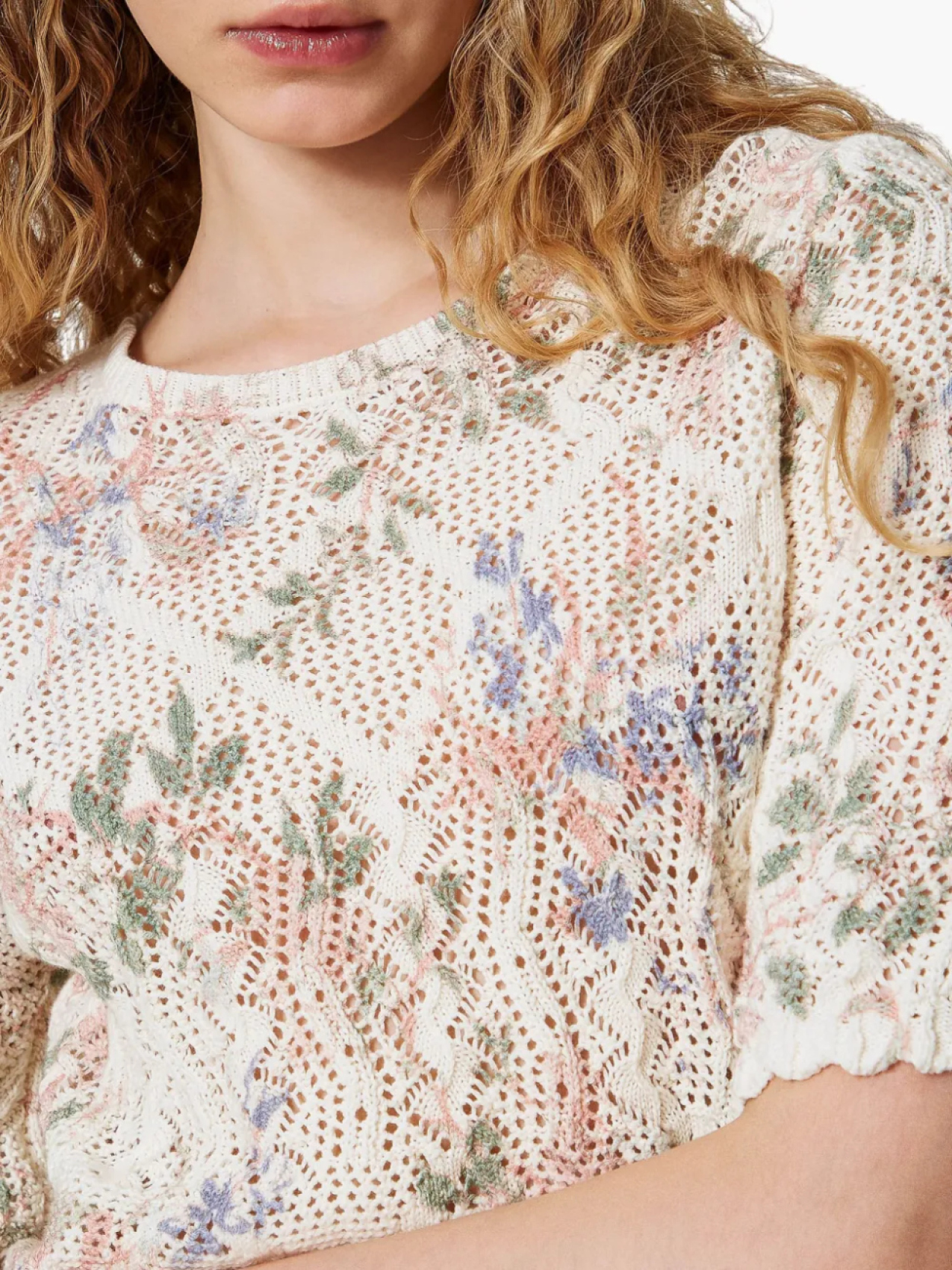 Белый круглый вырез, рукава три четверти, цветочный мотив, открытая вязка