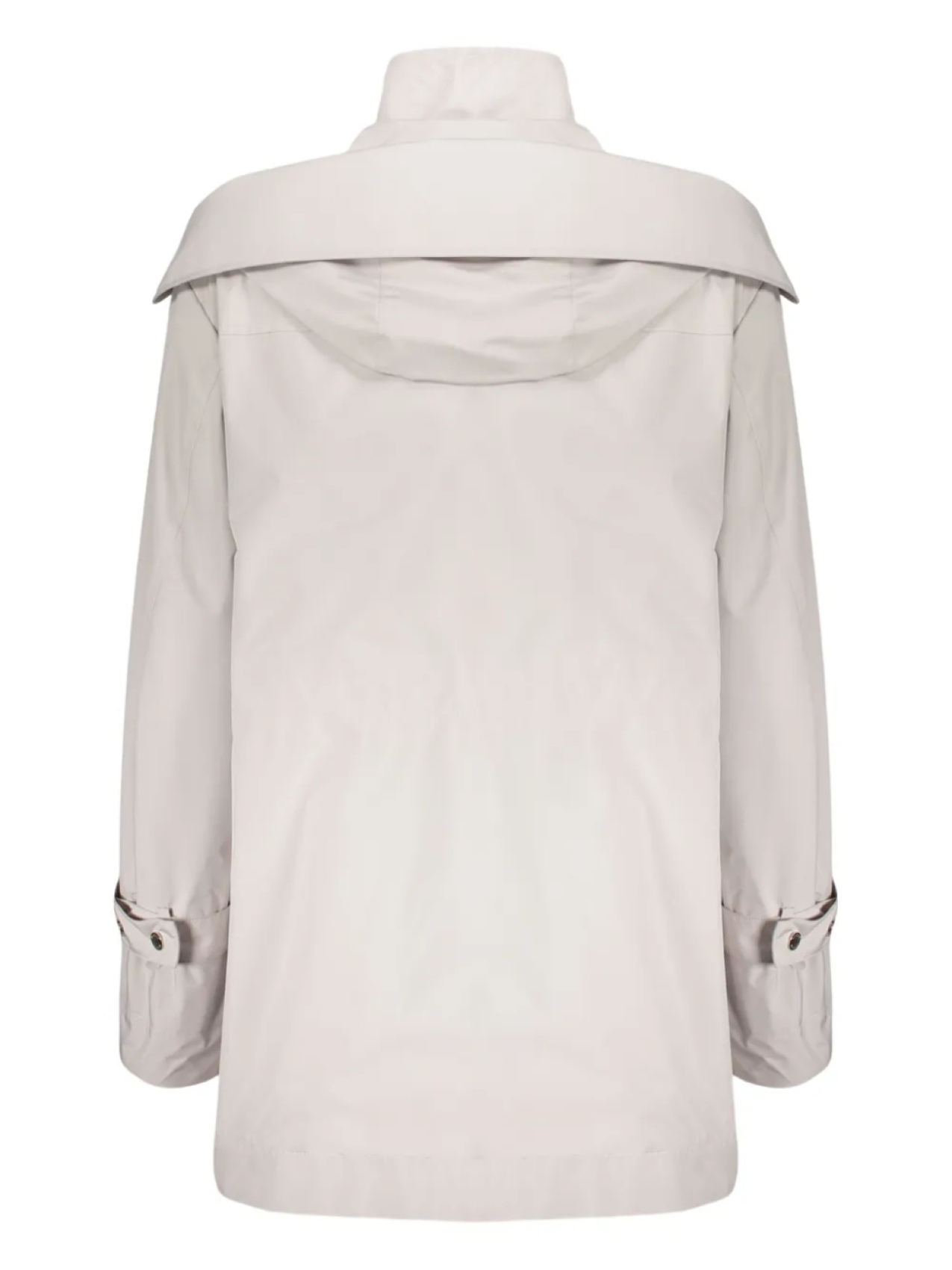 Застежка на кнопку и молнию цвета экрю спереди, съемный капюшон, два боковых кармана с клапанами, манжеты с поясом